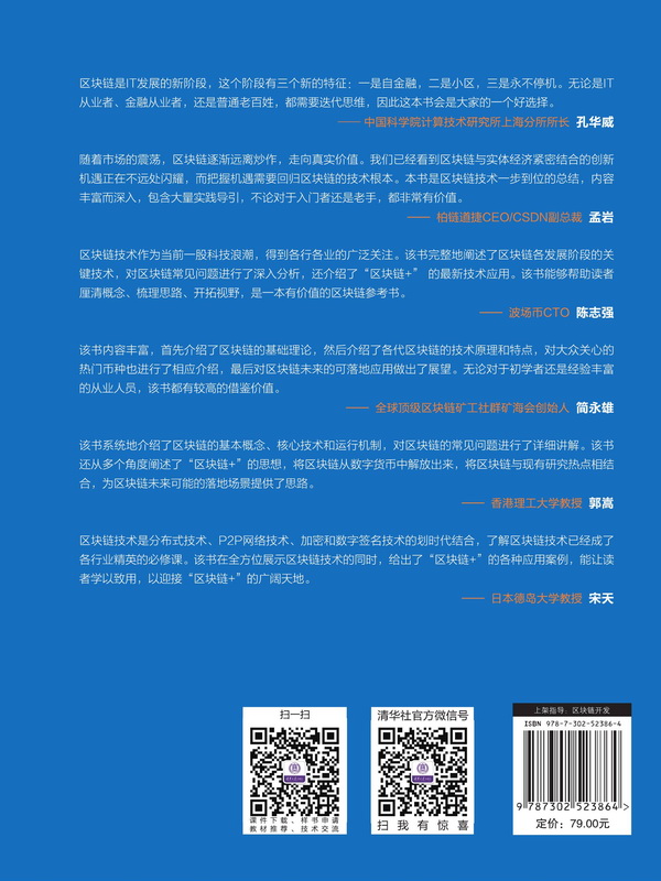 本书首先梳理了区块链和数字货币的历史与现状,详细阐述了区块链的基础理论和运行原理; 然后根据区块链技术的发展路线,分别阐述了区块链1.0比特币、区块链2.0以太坊和区块链3.0的基本概念、核心技术、架构特点和运行机制; 之后分析总结了当前热门的一些数字货币和商业应用,深入分析了区块链常见问题; 最后探讨了区块链与虚拟化、人工智能、物联网等新技术结合的概念、思路和关键技术,并结合课题组目前正在进行的研究工作,详细介绍了深度学习常用框架及其与区块链的融合方案。 本书可作为学习区块链技术的参考书,也可作为高等院校相关课程的教材,还可供从事区块链技术领域工作的工程技术人员阅读。