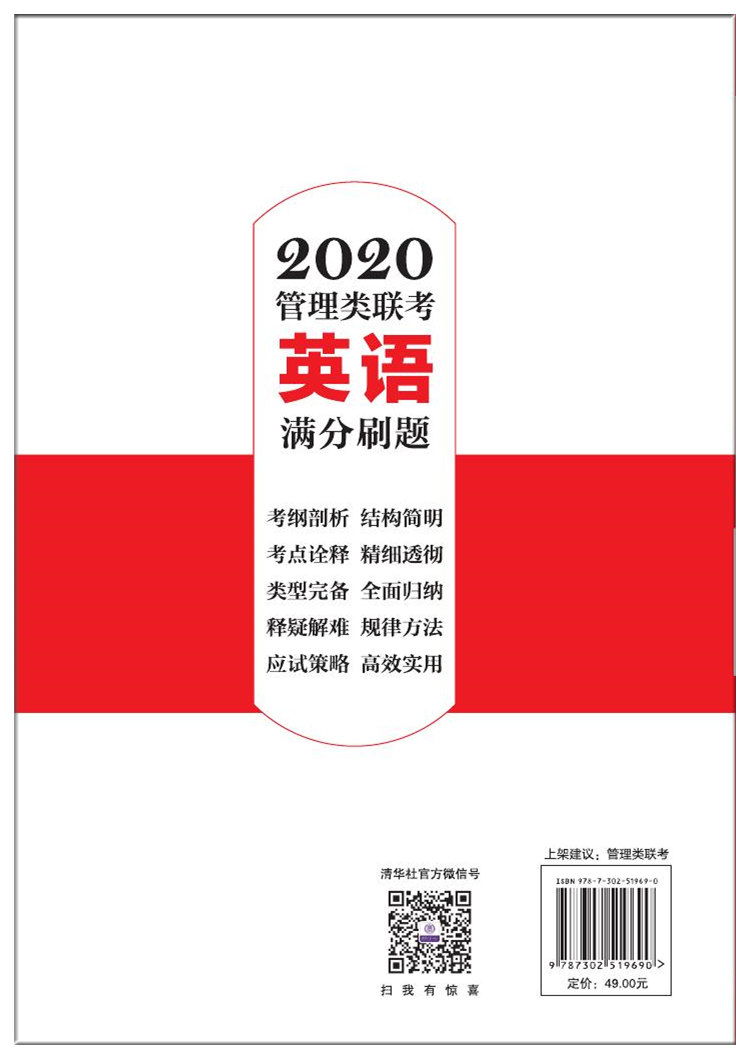 前言 本书为《2020管理类联考英语二基本功》的姐妹书,专供冲击英语二80分以上的学员使用。本书的出版,需要感谢的人很多。首先要感谢笔者所有可爱的学生和选择本书的读者,他们的乐观坚强和求知若渴是激励笔者不断前进的永恒动力。接下来要感谢笔者的家人,他们一直以来对笔者无条件的信任和包容,使得笔者能做任何想做而不是不得不做的事。还要感谢笔者尊敬的各位合作伙伴: 曹其军老师、饶思中老师、王帅老师、桂国祥老师、孔鹏老师、马乙平老师、赖班文老师、耿大伟老师、方西奇老师和刘涛老师,他们的专业和远见一直为笔者钦佩。还要感谢为本书供稿及审订的郁小芳老师和张语然老师,他们的才华和天赋为本书增色颇多。也要感谢渥德的各位同事在本书成书过程中的给予我的鼓励、意见和帮助。最后,感谢为本书出版而付出努力的所有清华大学出版社的老师们。一件事情要完成,自己努力就可以了。一件事情要卓越地完成,自己有天大的本事也不行,需要家人的支持,需要他人的信任,需要命运的垂青,需要朋友的帮助,需要时机的适宜,需要对手的鞭策。总之,感谢有你,感谢生活,感谢一切。 管理类联考英语二中,大家都知道多做练习的重要性,也看到了市面上大量的此类图书。那么,笔者为什么仍有自信出一本这样的书呢?那是因为笔者坚信此书独具五大特色。 第一,选材精细。 阅读和翻译,每一道题都来自和历年真题同源的最新外刊。阅读每道题都仿自历年真题,这是现在市面上同类书籍完全无法做到的。完型和写作,每一道题的难度经过命题组成员审订,都和历年真题完全一致。每一位读者均可放心使用。 第二,分析到位。 完型每个选项的意思都进行了分析和讲解,阅读每道题的答案都是从...