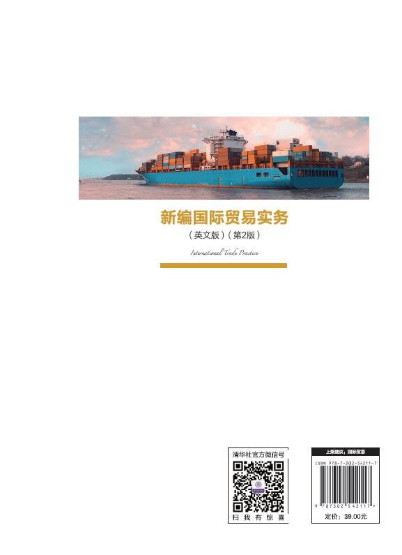 前 言 中国加入WTO,与世界的经济贸易联系更加密切,使得中国与世界其他国家的合作具有了更加广阔的前景。因此,培养既具有国际贸易专业知识又精通外语的复合型人才是目前高等教育的首要任务。正是在这样的时代大背景下,我们于2005年着手编写了《新编国际贸易实务》一书(中文版,清华大学出版社2006年8月第1版,2009年5月第2版),其目的就是帮助广大经贸类专业的学生掌握专业知识和具体的商务贸易规程。 随着全球经济一体化程度的加深,一方面我国将需要更多的外贸人才,另一方面对国际贸易专业的学生将提出更高标准,要求其在熟悉掌握专业知识的基础上,能够使用英语进行业务磋商,利用网络营销开展全球贸易并且熟知国际贸易相关条款和惯例。可见,对于国际贸易专业的学生来说,提高自身的综合业务素质是目前最为迫切的任务。正是基于此目的,我们在对《新编国际贸易实务》中文版进行修订的同时,编写了这本与中文版《新编国际贸易实务》相对应的英文版教材,旨在从根本上提高国际贸易实务的双语教学水平。 本书以进出口贸易的主要业务环节为主线,系统地介绍了各个环节的操作规程和国际惯例,书中的英文材料大多选自国外原汁原味的英语专业资料,不仅句式地道,而且力求做到英语知识与专业知识相结合,克服了国内教材重语言形式轻语言运用能力的弊端。本书每一章节的编写都注重材料翔实全面,语言难易适中,专业性强的特点。在第1版的基础上,本书结合国际贸易的变化和发展趋势,根据一些贸易规则的修订作了适当的调整。对案例、引用资料进行了更新,有针对性地拓宽了知识领域。本书还在各章后配备了丰富的各类习题,供学生课后练习或自学检测使用。...