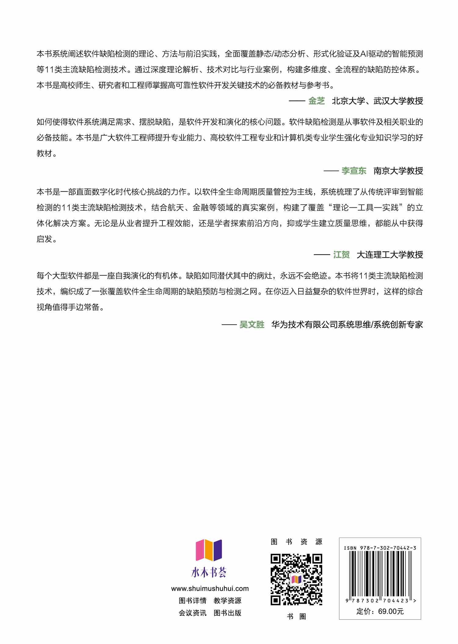 "u 全面覆盖11类缺陷检测技术:本书系统整合软件评审、程序分析、软件度量等11类核心方法,构建多维度缺陷检测体系,帮助读者掌握从静态分析到动态测试、从传统手段到智能检测的全流程技术,提升软件质量保障能力。