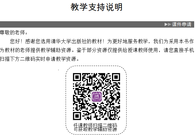 感谢您选用清华大学出版社的教材!我们为采用本书作为教材的老师提供教学辅助资源。请点击 资源下载—课件下载 微信扫描二维码 下载教学资源。如有疑问请致电010-8347(0332)/(0142)