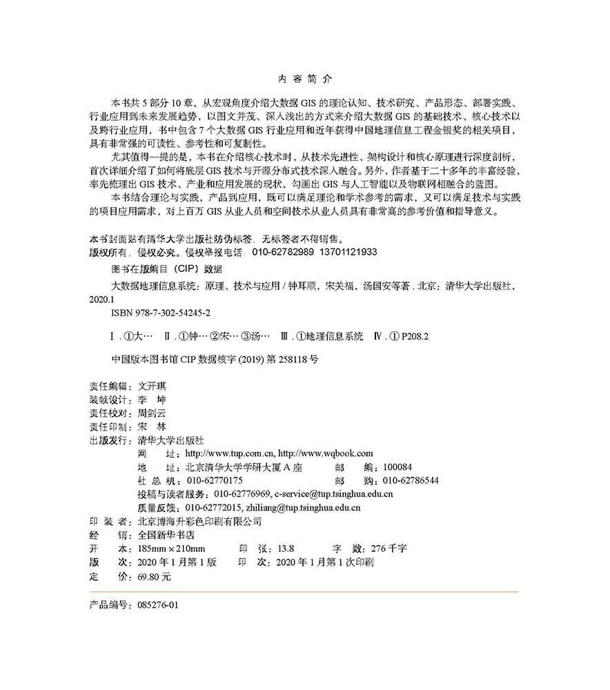 《大数据地理信息系统:原理、技术与应用》共5 部分10 章,从宏观角度介绍大数据GIS 的理论认知、技术研究、产品形态、部署实践、行业应用到未来发展趋势,以图文并茂、深入浅出的方式来介绍大数据GIS 的基础技术、核心技术以及跨行业应用,书中包含7 个大数据GIS 行业应用和近年获得中国地理信息工程金银奖的相关项目,具有非常强的可读性、参考性和可复制性。 尤其值得一提的是,本书在介绍核心技术时,从技术先进性、架构设计和核心原理进行深度剖析,首次详细介绍了如何将底层GIS 技术与开源分布式技术深入融合。另外,作者基于二十多年的丰富经验,率先梳理出GIS 技术、产业和应用发展的现状,勾画出GIS 与人工智能以及物联网相融合的蓝图。 《大数据地理信息系统:原理、技术与应用》结合理论与实践,产品到应用,既可以满足理论和学术参考的需求,又可以满足技术与实践的项目应用需求,对上百万GIS 从业人员和空间技术从业人员具有非常高的参考价值和指导意义。