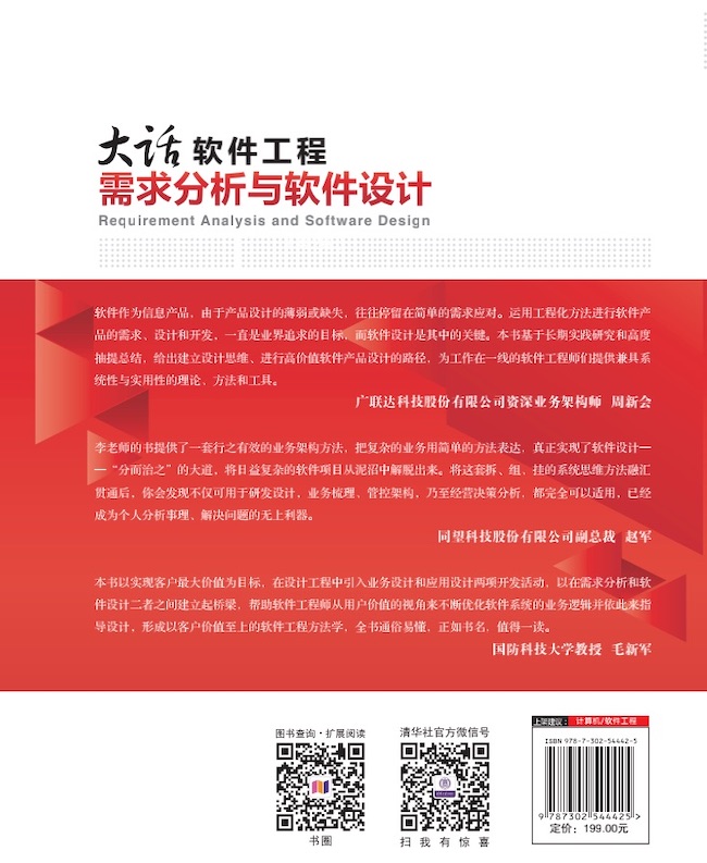 《大话软件工程——需求分析与软件设计》面向从事软件分析与设计相关工作的读者。《大话软件工程——需求分析与软件设计》的重点是在软件工程中增加了业务设计和应用设计的部分,提出了软件设计工程化的模式,支持进行定性、定量的软件项目管理,是一本实操型的软件工程工具书。全书共分为6篇22章,分别介绍了业务分析与设计的理论、需求工程的调研与分析方法、业务的分析与设计方法、应用设计方法、业务用例和应用用例的编写方法、需求和设计的配套模板、规格书标准等。 《大话软件工程——需求分析与软件设计》可作为软件工程师(包括需求、设计、开发、实施)、产品/项目经理、管理咨询师的实用工具书、培训机构的设计资格培训教材,以及普通高等院校管理信息专业、计算机专业学生学习软件设计方法的参考书。