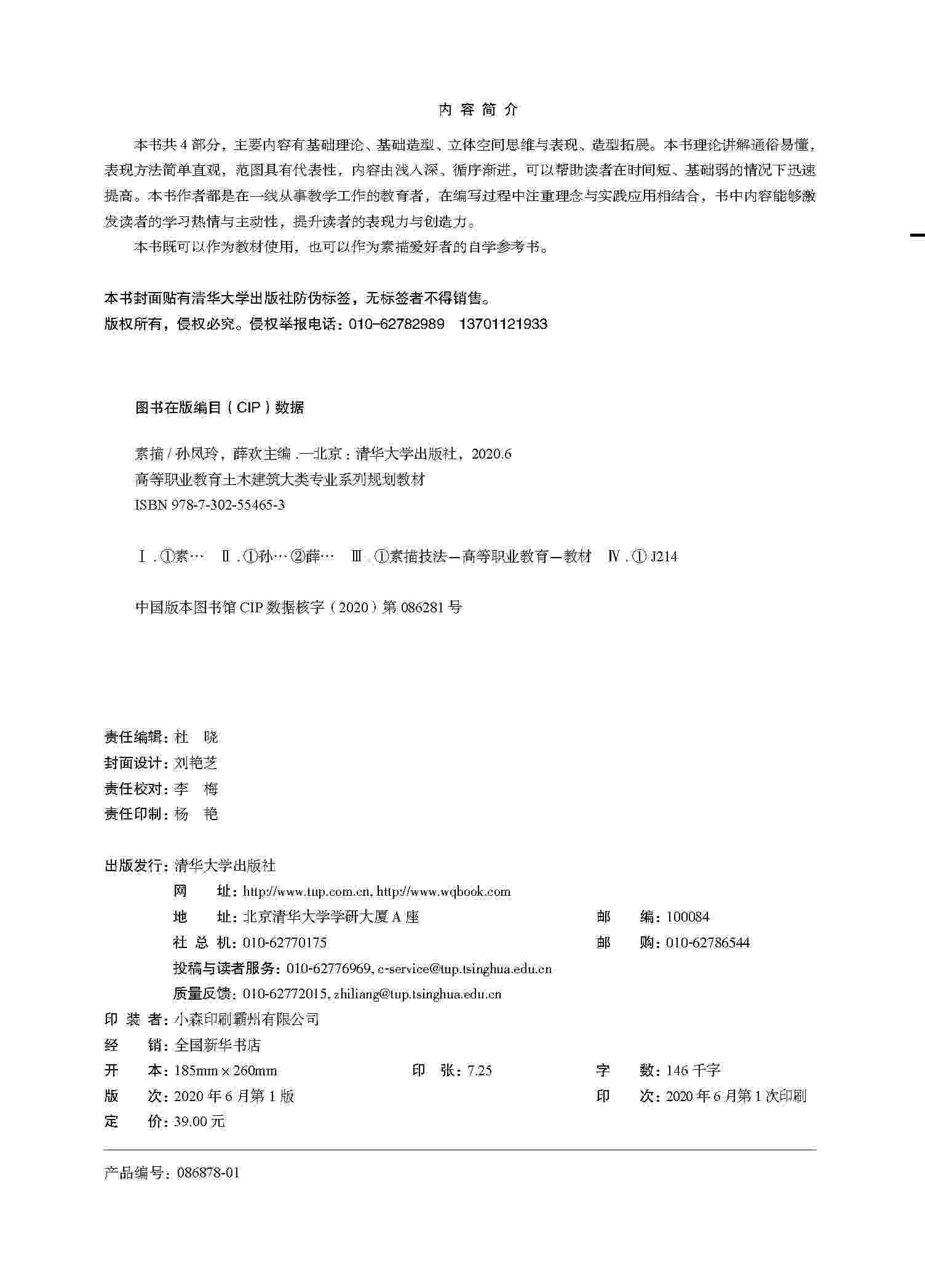 在造型艺术领域,素描是一个古老的话题,是相对于彩色绘画的一个概念。素描是运用木炭、铅笔、钢笔等工具,以线条画出物象明暗的单色画。中国传统的白描和水墨画也可以称之为素描。素描以单色线条来表现,着重于结构与形式,不像色彩绘画着重于总体与色彩。空间思维与三维理念是学素描的开始,素描是应用空间思维面对客观世界所有物象,借助特定的对象、环境、光影,运用透视学、解剖学和构图学原理,通过三维理念传达物象的立体感与空间感。 本书针对美术专业及设计学专业初学者的学习特点而编写,与行业需求融合,参照美术专业与设计专业人才的培养目标,力图把传统素描与现代素描的表现技法贯穿于每一部分的内容中。本书深入浅出、以点带面、删繁就简、切合实际,书中内容通俗实用,可以拓展读者思维,调动读者的创造力,从而达到学习与应用相结合的目的。 本书内容由孙凤玲与薛欢主笔完成。感谢李楠、胡少杰等为本书提供了大量的个人绘画作品。本书在编写过程中还参考了许多文献资料,在此一并表示诚挚的感谢。由于编者水平有限,书中不足之处在所难免,望广大读者批评、指正。 编者2020年 1月