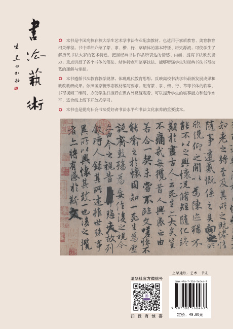 书法艺术是大学生基本素养课程之一。通过开设该课程,使学生掌握书法文化常识:包括书法的基本概念和艺术特点,了解历代书法大家和经典作品及其艺术特色。同时,也提高学生对经典作品的鉴赏能力,能大体把握作品所表达的情感、内涵;能对经典作品具有临摹能力以及简单创作能力。本教材主要特色是利用先进在线教学平台普及公共书法教育,是一种交叉学科、新形态特征点学科基础教材。教材形成了传统艺术与现代技术结合,线上线下结合,与国内外同类课程比较,也有自己特色。