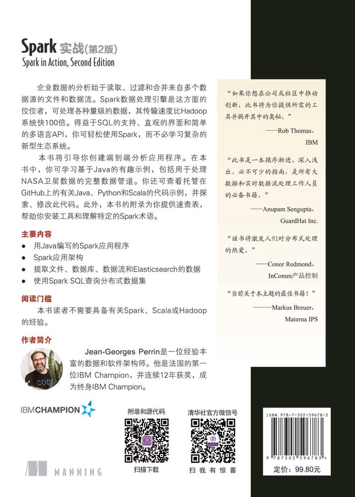 前 言 Apache Spark早已闻名遐迩,不必赘述。如果你正在阅读本部分,那么你可能多多少少对《Spark实战(第2版)》的内容有所了解:大规模数据工程和数据科学、分布式处理等。但是从Rob Thomas的序言和第1章开始,很快你就会发现,Spark的内容远不止于此。 就像Obelix沉迷于魔药 一样,2015年,我开始痴迷于Spark。当时,我在一家法国计算机硬件公司工作,协助设计高性能的数据分析系统。与众人一样,一开始我对Spark持怀疑态度。之后,我开始使用它,到如今,你就看到了《Spark实战(第2版)》的问世。从最初的怀疑,到最后我对如此神奇的工具产生了真正的热情,这个工具使我们能以一种非常简单的方式处理数据——这就是我真诚的信念。 我用Spark启动了几个项目,这让我能够在Spark Summit、IBM Think以及All Things Open、Open Source 101 上发表演讲。通过本地的 Spark 用户组,我在北卡罗来纳州的Raleigh-Durham 地区与他人合作进行了动画制作。这让我结识了一些优秀的人,还看到了大量与Spark相关的项目。结果,我的热情继续燃烧。 《Spark实战(第2版)》分享了我的这种热情。 虽然《Spark实战(第2版)》中的示例(或实验)基于Java,但唯一的存储库也包含Scala和Python。随着Spark 3.0的推出,Manning团队和我决定确保《Spark实战(第2版)》讲解的是最新版本,而不是过期的想法。 也许你已经猜到了,我喜欢漫画书,且伴随着漫画书长大。...