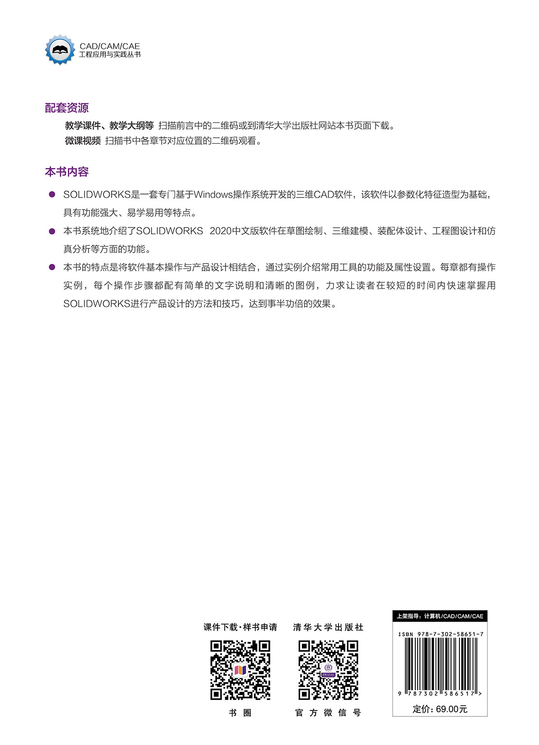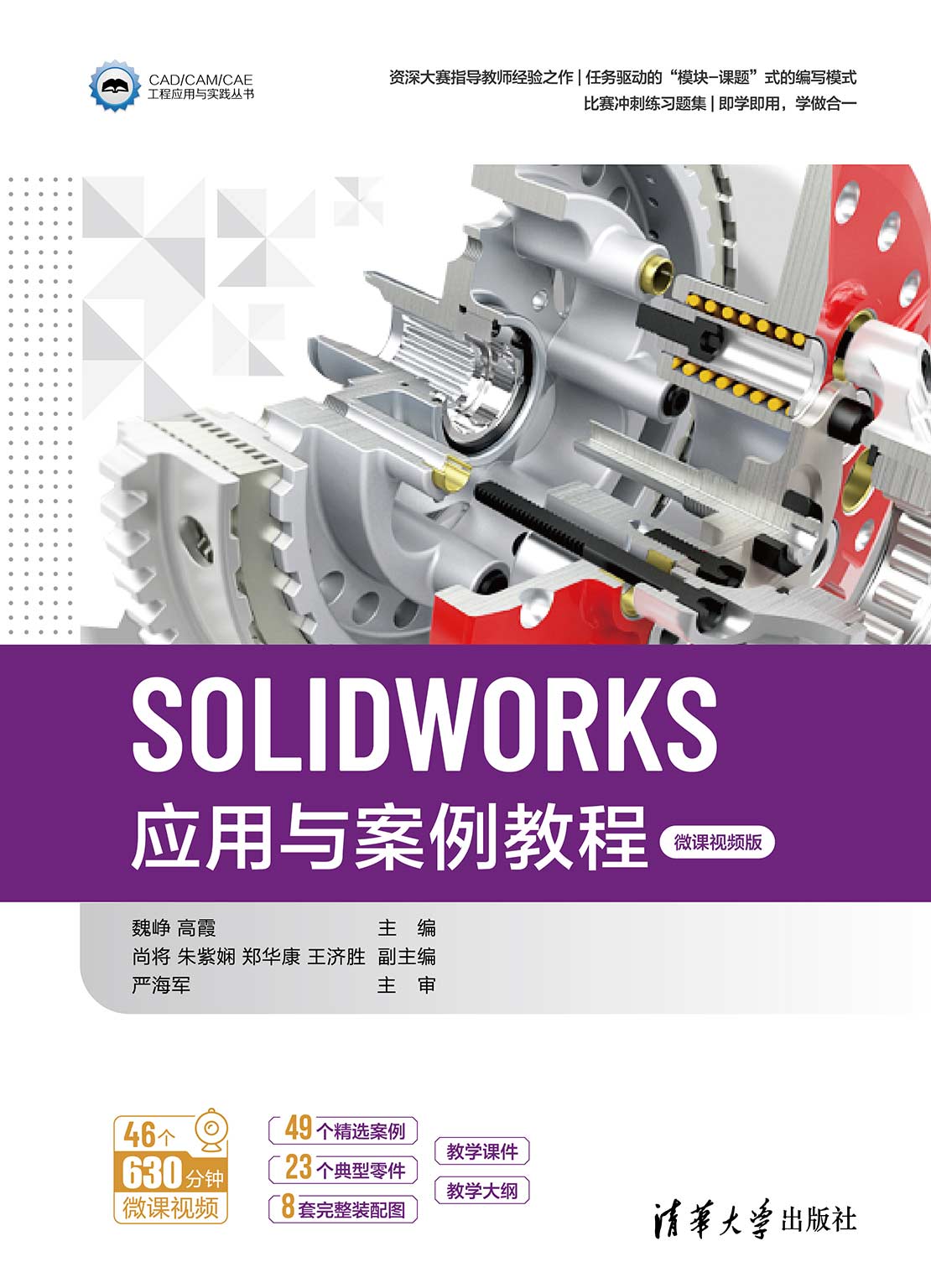 SOLIDWORKS是一套专门基于Windows操作系统开发的三维CAD软件,该软件以参数化特征造型为基础,具有功能强大、易学易用等特点。《SOLIDWORKS应用与案例教程(微课视频版)》系统地介绍了SOLIDWORKS 2020中文版软件在草图绘制、三维建模、装配体设计、工程图设计和仿真分析等方面的功能。本书的特点是将软件基本操作与产品设计相结合,通过实例介绍常用工具的功能及属性设置。每章都有操作实例,每个操作步骤都配有简单的文字说明和清晰的图例,力求让读者在较短的时间内快速掌握使用SOLIDWORKS进行产品设计的方法和技巧,达到事半功倍的效果。 为方便教学,《SOLIDWORKS应用与案例教程(微课视频版)》配套有PPT教学课件、微课视频、图片等教学资源,其中部分资源以二维码形式在书中呈现,具体获取方式见前言。 《SOLIDWORKS应用与案例教程(微课视频版)》可作为高等职业院校装备制造大类专业或应用型本科相关专业的教学用书,也可作为机械行业技术人员、操作人员的岗位培训用书。