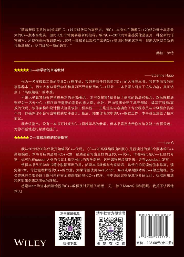 前 言 作为带有类的C的继承者,丹麦计算机科学家Bjarne Stroustrup于1982年发明了C++。1985年,发布了第一版的“C++程序设计语言”。第一个标准化版本的C++在1998年发布,称为C++98。在2003年,C++03发布并包含了一些小的更新。在那之后,C++沉默了一段时间,但吸引力开始慢慢增强,导致该语言在2011年进行了重大更新,称为C++11。从那以后,C++标准委员会以3年的周期发布更新的版本,出现了C++14、C++17以及现在的C++20。总之,2020年发布了C++20之后,C++已经将近40年了,并且仍然很强大。在2020年的大多数编程语言排名中,C++都排在前四位。它被广泛用于各种硬件,从带有嵌入式微处理器的小型设备一直到超级计算机。除了广泛的硬件支持,C++还可以用来解决几乎任何编程工作,如移动平台上的游戏、对性能要求严格的人工智能(AI)和机器学习(ML)软件、实时三维图形引擎、底层硬件驱动程序、整个操作系统等。C++程序很难与任何其他编程语言相匹配,因此,多年来,C++都是编写性能卓越、功能强大的企业级面向对象程序的事实标准语言。尽管C++语言已经风靡全球,但这种语言却难以完全掌握。专业C++程序员使用一些简单但高效的技术,这些技术并未出现在传统教材中;即使是经验丰富的C++程序员,也未必完全了解C++中某些很有用的特性。 编程书籍往往重点描述语言的语法,而不是语言在真实世界中的应用。典型的C++教材在每一章中介绍语言中的大部分知识,讲解语法并列举示例。《C++20高级编程(第5版) 》不遵循这种模式。《C...