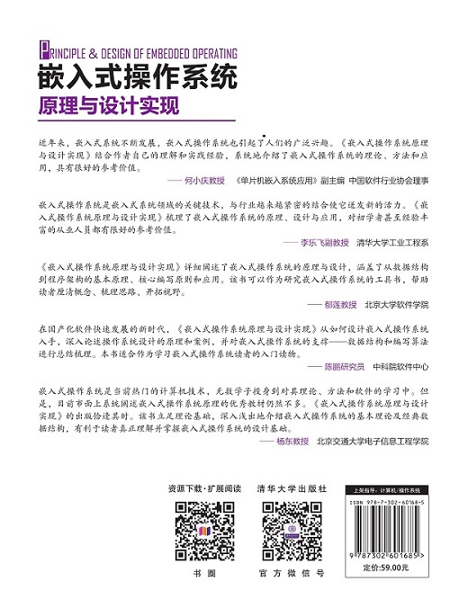 本书内容可分为两大部分。第一部分(第1~10章)介绍了嵌入式操作系统原理。其中,第1章介绍 嵌入式操作系统基础知识; 第2章介绍嵌入式系统硬件与操作系统; 第3章介绍嵌入式操作系统的体系 结构、基本概念和设计嵌入式操作系统的基本要求; 第4章详细介绍嵌入式操作系统常用数据结构; 第5 章详细介绍嵌入式操作系统的一般启动方式、BootLoader的编写方式和μCOS-Ⅱ、μCLinux; 第6章详细 介绍任务管理的各组成模块及其实现方式; 第7章详细介绍嵌入式操作系统中资源管理的各种方式及实 现,并通过对μCOS-Ⅱ的改造,讲授了如何在已有嵌入式操作系统中实现所需功能模块的扩展; 第8章详 细介绍任务间通信方式及其实现; 第9章详细介绍内存管理方式及实现; 第10章详细介绍中断与异步通 信的方式及实现。第二部分(第11~14章)介绍了常用嵌入式操作系统及其应用。其中,第11章介绍 Linux内核及其驱动编写; 第12章介绍μCLinux内核及驱动的编写; 第13章介绍安卓体系结构及蓝牙驱 动的编写; 第14章介绍Windows CE内核及驱动编写。 本书以编写操作系统为目标,对现有操作系统进行剖析,层次清晰,语言通俗易懂。学习本书需要有 一定的C语言阅读能力和硬件的入门知识。本书可作为高等院校嵌入式系统、物联网、计算机、电子信息、 通信工程等专业本科生、研究生的程序设计教材,也适合作为编程开发人员的培训教材,同时本书可供广 大嵌入式系统技术爱好者自学使用。