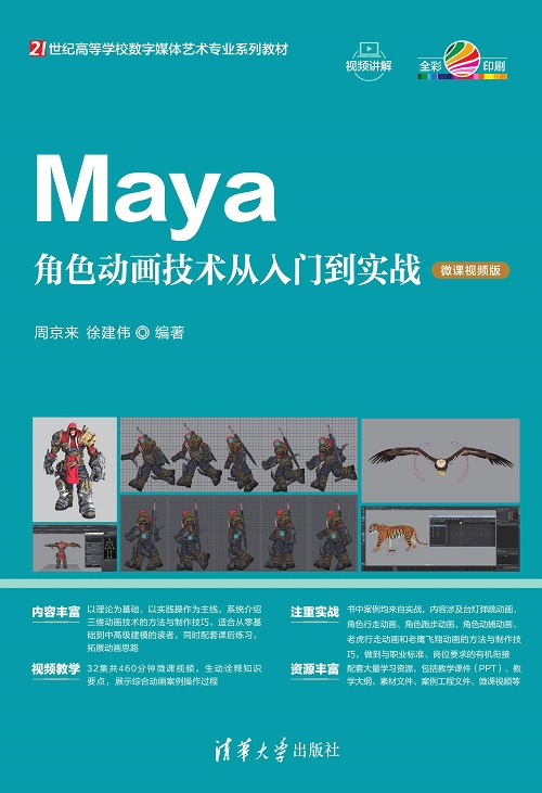 Maya 角色动画技术从入门到实战 微课视频版 II ●实用技能为核心 本书案例选材主要从适应当前社会应用型人才的需求出发,以实用技能为核心,将动画 技术的理论知识和真实企业三维动画的实践案例紧密结合。本书注重通过丰富的项目案例来 帮助读者更好地学习和理解三维动画的相关知识和应用技巧。本书涉及的案例主要有小球基 础动画、台灯弹跳动画、角色Pose设计、角色行走动画、角色跑步动画、老虎行走动画、老 鹰飞翔动画、角色动捕数据动画应用。 ●创新原则 本书及时根据新技术、新标准、新规范等更新编写内容,图文并茂,每章案例都配有视 频教程,语言生动,突出前沿,着力打造精品。采用五维一体教学法中的“项目实践法”的 教学方式。案例中设计了很多技巧提示,读者不仅可以快速掌握一定的实战经验,而且可以 快速掌握三维动画的制作技巧。 二、配 套 资 源 ●教学课件(PPT)、教学大纲、素材文件、案例工程文件等资料,可扫 描此处二维码下载或者到清华大学出版社官方网站本书页面下载。 ●微课视频(460分钟,32集),可扫描正文中各章节相应位置的二维码观看。 三、致 谢 本书由资深动画师周京来负责全书统稿,编写第4~8章,并制作配套的教学文件、素材 文件及每章案例的视频教学文件;由石家庄工程职业学院的徐建伟老师编写第1~3章。 本书能够顺利出版要感谢我的父母、家人、领导和朋友们的支持与鼓励,特别感谢精英 集团、精英教育传媒集团、河北传媒学院、石家庄工程职业学院、河北天明传媒有限公司、 北京精英...