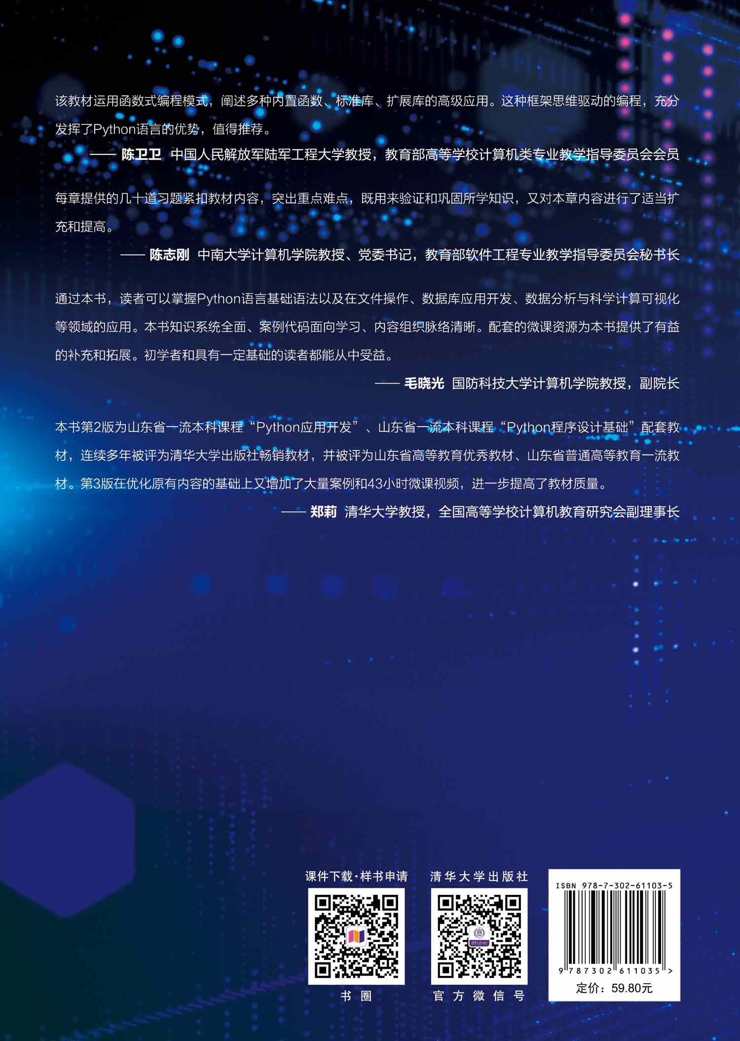 提供课件、参考答案、大纲,咨询QQ:2301891038(仅限教师)。本书第二版为山东省高等教育优秀教材、山东省普通高等一流教材,山东省一流本科课程“Python应用开发”配套教材,山东省一流本科课程“Python程序设计基础”配套教材,清华大学出版社2019、2020年畅销教材