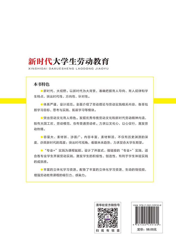 前言 2018年全国教育大会上,习近平总书记明确提出构建德智体美劳全面培养的教育体系,把劳动教育纳入培养社会主义建设者和接班人的总体要求。2020年3月,中共中央、国务院发布《关于全面加强新时代大中小学劳动教育的意见》(以下简称《意见》),《意见》指出,劳动教育是中国特色社会主义教育制度的重要内容,是学生成长的必要途径,具有树德、增智、强体、育美的综合育人价值,直接决定了社会主义建设者和接班人的劳动价值取向、劳动精神面貌和劳动技能水平。《意见》要求设置劳动教育课程,将劳动教育纳入中小学国家课程方案和职业院校、普通高等学校人才培养方案,形成具有综合性、实践性、开放性、针对性的劳动教育课程体系。《意见》对新时代劳动教育做了顶层设计和全面部署,意义重大,影响深远。 新时代劳动教育,必须坚持以习近平新时代中国特色社会主义思想为指导,全面贯彻党的教育方针,落实全国教育大会精神,坚持立德树人,坚持培育和践行社会主义核心价值观,紧密结合经济社会发展变化和学生生活实际,探索具有中国特色的劳动教育体系,培养学生正确劳动价值观和良好劳动品质,促进学生形成正确的世界观、人生观、价值观。 新时代劳动教育,要使学生理解和形成马克思主义劳动观,牢固树立劳动最光荣、劳动最崇高、劳动最伟大、劳动最美丽的观念;体会劳动创造美好生活,体认劳动不分贵贱,热爱劳动,尊重普通劳动者,培养勤俭、奋斗、创新、奉献的劳动精神;具备满足生存发展需要的基本劳动能力,形成良好劳动习惯。 作为教育工作者,我们必须全面贯彻党的教育方针,增强新时代劳动教育的紧迫感、责任感、使命感。《新时代大学生劳动教育》作者认真研...