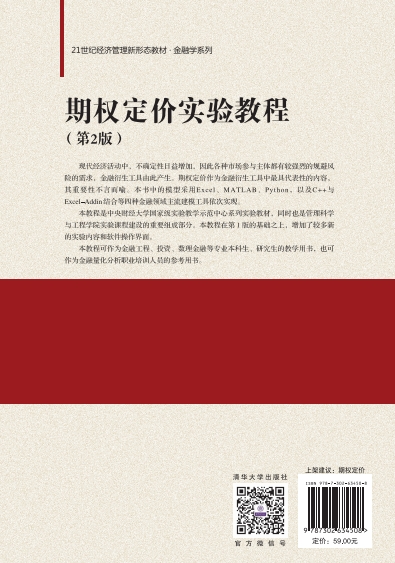 前 言 《期权定价实验教程》的修订工作主要由宋斌教授、张少钦副教授、孙辉和纳赛阳负责完成。在这次修订中,进行了如下修改和增补: (1)本教程第1章至第6章,以及第8章中均增加了相应内容的Python版本的算法实现。从而更加适应大数据和人工智能背景下,Python在财经领域,特别是金融领域的广泛应用的时代需求。 (2)本教程第3章隐含波动率和波动率微笑的数值实验中增加了基于Python开发的用于绘制波动率微笑的GUI,从而可以在输入一定的数据之后得到波动率微笑图形,更加便捷,同时也提高了应用价值。 (3)在第8章期权定价数值实验——期权计算软件的界面设计中,在原有基于Excel和MATLAB的GUI设计期权价格计算器内容之外,增加了基于Python Optlib库的期权定价内容,并且对个股期权的单一期权和组合期权策略的终端支付情况和策略盈亏情况进行了详尽的分析,进一步扩大了期权定价的应用范围(从单一期权扩展到期权组合)。 (4)改写了第6章有限差分方法的数值实验中的原理部分的一些内容。 (5)改正了原书中的一些印刷错误。 本书配备了丰富的代码资源,需要实验配套代码的读者可以通过邮件与编者联系:selviasong@163.com。考虑到开发代码的巨大投入,代码将采取适当收费的方式向读者提供。采用本教程进行教学的教师将免费获得教材全部配套代码资源。 本教程在修订过程中,得到了中央财经大学管理科学与工程学院刘志东院长、投资系荆中博主任的大力支持和帮助,同时得到了中央财经大学管理科学与工程学院学科建设经费的资助,在此一并表示感谢...