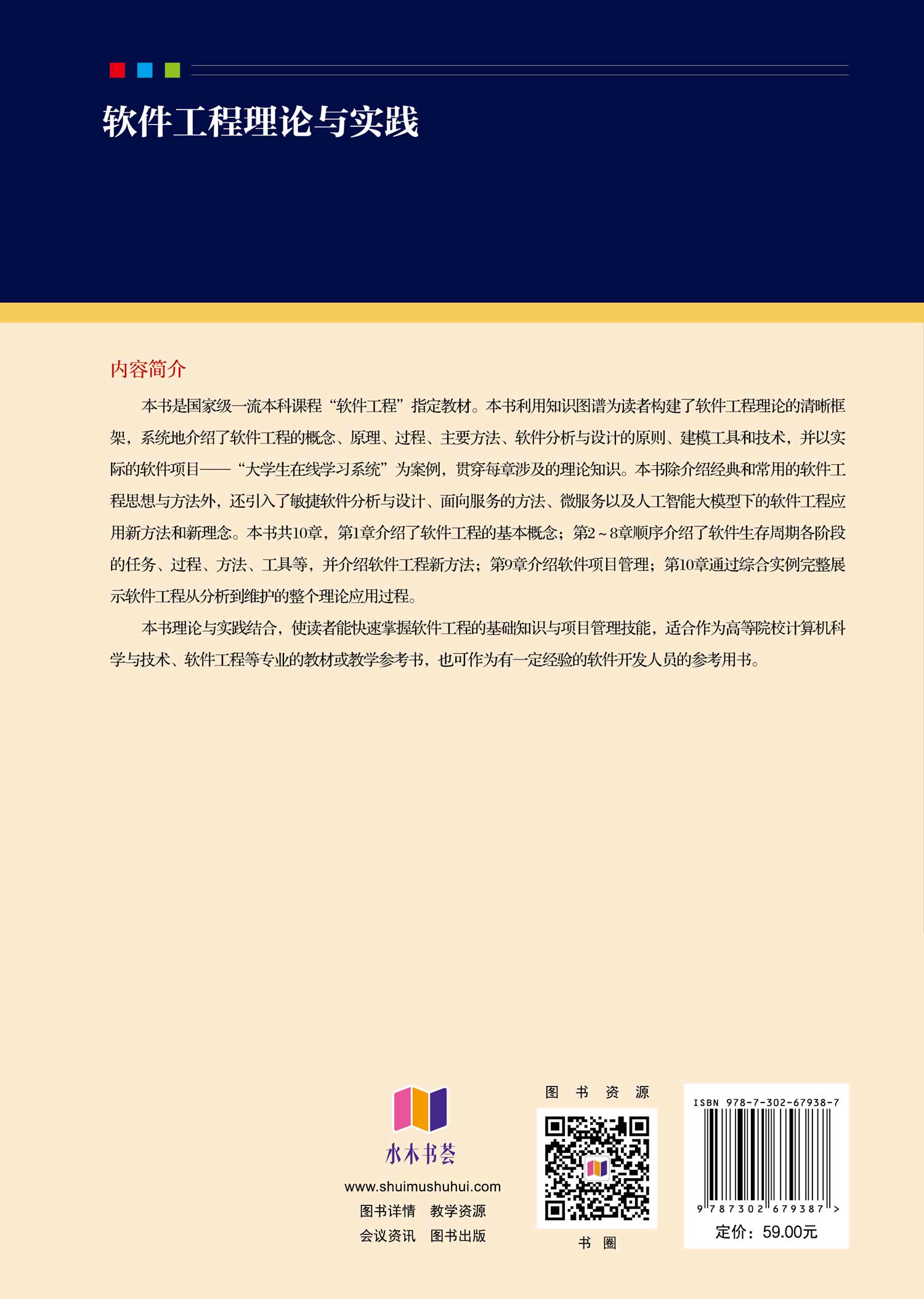 "本书是国家级一流本科课程“软件工程”指定教材。本书利用知识图谱为读者构建了软件工程理论 的清晰框架,系统地介绍了软件工程的概念、原理、过程、主要方法、软件分析与设计的原则、建模工 具和技术,并以实际的软件项目——“大学生在线学习系统”为案例,贯穿每章涉及的理论知识。本书 除介绍经典和常用的软件工程思想与方法外,还引入了敏捷软件分析与设计、面向服务的方法、微服务 以及人工智能大模型下的软件工程应用新方法和新理念。本书共 10 章,第 1 章介绍了软件工程的基本概 念;第2~8 章顺序介绍了软件生存周期各阶段的任务、过程、方法、工具等,并介绍软件工程新方法; 第9 章介绍软件项目管理;第 10 章通过综合实例完整展示软件工程从分析到维护的整个理论应用过程。 本书理论与实践结合,使读者能快速掌握软件工程的基础知识与项目管理技能,适合作为高等院校 计算机科学与技术、软件工程等专业的教材或教学参考书,也可作为有一定经验的软件开发人员的参考 用书。 "