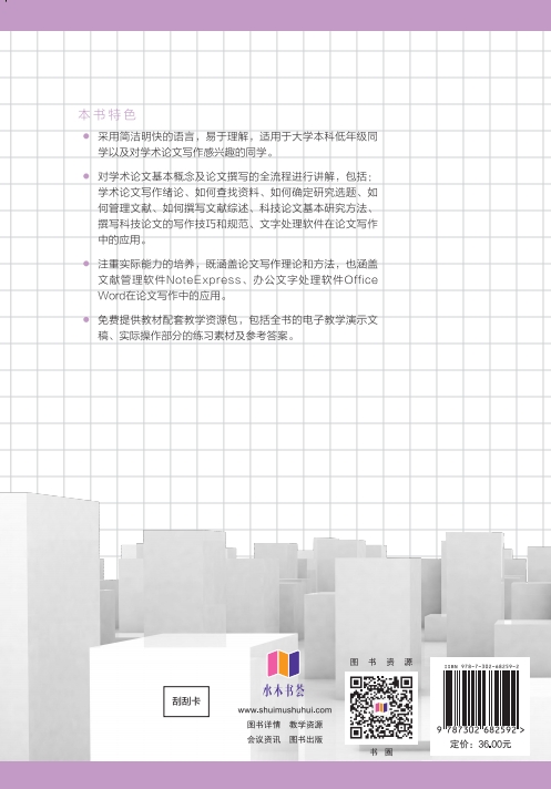 前言 信息化、数字化、智能化等技术层出不穷,推动科学技术不断向前发展,各个学科不断进行融合,学科交叉和学术交流进入又一个旺盛发展时期。学术交流离不开学术论文,撰写学术论文是进行学术交流的一条重要途径。 面对大学低年级的同学,培养其学术论文写作能力,使其在大学生涯早期树立科学的学术论文写作观,是本书的一个重要目标。 本书按照学术论文的基本撰写顺序进行介绍,主要内容包括: 学术论文写作绪论、如何查找资料、如何确定研究选题、如何管理文献、如何撰写文献综述、科技论文基本研究方法、撰写科技论文的写作技巧和规范、文字处理软件在论文写作中的应用。在每章的开始给出明确的学习目标,然后开始讲解,最后给出本章扩展阅读、小结和练习题。 本书采用简洁明快的语言,从学术论文的内涵、基本结构入手,抽丝剥茧,逐步揭开撰写学术论文的神秘面纱。 本书是全国高等学校计算机教育研究会2022年教育研究项目(课题编号: CERACU2022P02)成果。本书出版受到北京语言大学教材出版基金资助。 本书配有的电子教学演示文稿、实际操作部分的练习素材及参考答案,均可扫描下方二维码获取。 由于作者水平有限,书中难免有疏漏及不妥之处,敬请各位读者批评指正! 黄月 2024年7月