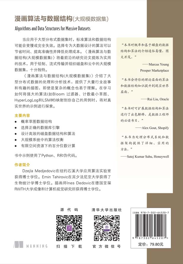 当应用于大型分布式数据集时,标准算法和数据结构可能会变慢或完全失效。选择专为大数据设计的算法可以节省时间、提高准确性并降低处理成本。《漫画算法与数据结构(大规模数据集)》将最前沿的研究论文提炼为实用的技术,用于绘制、流式传输并组织磁盘和云中的大规模数据集,十分独特。 大规模数据集的算法与数据结构为大型分布式数据引入了处理和分析技术。《漫画算法与数据结构(大规模数据集)》作为指南,包含了行业故事和有趣的插图,使复杂的概念也易于理解。在学习如何将强大的算法(如Bloom 过滤器、计数最小草图、HyperLogLog和LSM树)映射到你自己的用例时,将对真实世界的示例进行探索。 主要内容: ● 概率草图数据结构 ● 选择正确的数据库引擎 ● 设计高效的磁盘数据结构和算法 ● 大规模系统中的算法权衡 ● 有限空间资源下的百分位数计算 Python、R和伪代码中的示例。