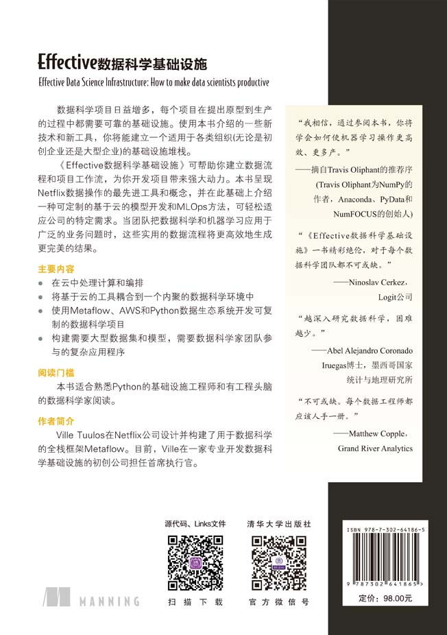 "数据科学项目日益增多,每个项目在提出原型到生产的过程中都需要可靠的基础设施。使用《Effective数据科学基础设施》介绍的一些新技术和新工具,你将能建立一个适用于各类组织(无论是初创企业还是大型企业)的基础设施堆栈。 《Effective数据科学基础设施》可帮助你建立数据流程和项目工作流,为你开发项目带来强大动力。《Effective数据科学基础设施》呈现Netflix数据操作的**进工具和概念,并在此基础上介绍一种可定制的基于云的模型开发和MLOps方法,可轻松适应公司的特定需求。当团队把数据科学和机器学习应用于广泛的业务问题时,这些实用的数据流程将更高效地生成更完美的结果。 主要内容 ● 在云中处理计算和编排 ● 将基于云的工具耦合到一个内聚的数据科学环境中 ● 使用Metaflow、AWS和Python数据生态系统开发可复制的数据科学项目 ● 构建需要大型数据集和模型,需要数据科学家团队参与的复杂应用程序"