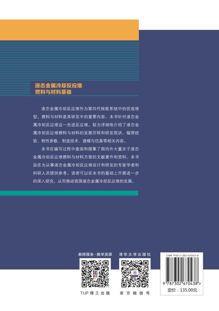 书主要对液态金属冷却反应堆燃料和材料进行较全面的介绍,内容包括: 液态金属冷却反应堆简介(液态金属冷却反应堆的发展历史、冷却剂优缺点、世界各国的研发、设计及运行现状)、液态金属冷却反应堆系统(热工水力特性、能量的产生与输送、热工设计准则、安全与事故管理)、液态金属冷却反应堆燃料(堆芯和燃料组件、世界各国的燃料循环活动、燃料的制造和辐照经验、燃料的热物理性质)、液态金属冷却反应堆结构材料(堆芯结构材料辐照损伤、包壳和其他结构材料的选择、燃料组件部件的制造技术、不锈钢与液态金属冷却剂的相容性、氧化物弥散强化钢开发计划)、液态金属冷却反应堆的耐事故燃料和材料(燃料与材料面临的主要问题、耐事故燃料和材料研发现状)、液态金属冷却反应堆多尺度建模与仿真(多尺度耦合算法、多尺度方法开发和验证)以及全书总结。