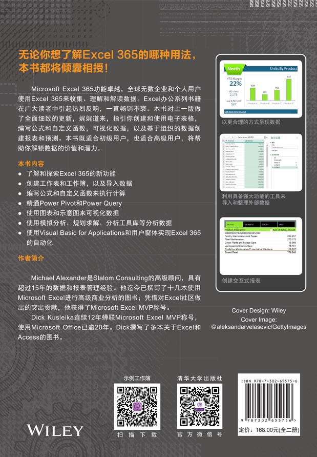 本书内容 ● 了解和探索Excel 365的新功能 ● 创建工作表和工作簿,以及导入数据 ● 编写公式和自定义函数来执行计算 ● 了解Power Pivot和Power Query ● 使用图表和示意图来可视化数据 ● 使用模拟分析、规划求解、分析工具库等分析数据 ● 使用Visual Basic for Applications和用户窗体实现Excel 365的自动化