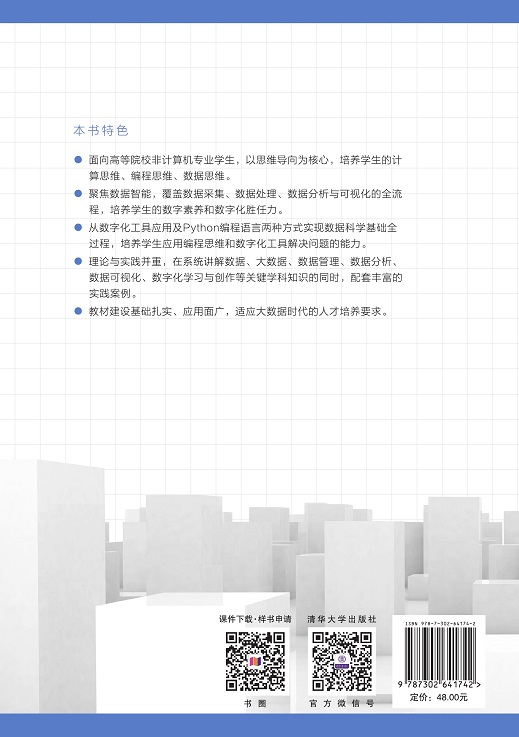 前言 随着互联网、云计算和大数据的蓬勃发展,信息技术得到了极大的普及与应用,在人文社科领域,定量研究越来越受到普遍重视。2014年,得克萨斯大学的艺术史学家Maximilian Schich在Science上发表了Quantitative social science. A network framework of cultural history,他带领团队收集了两千多年以来历史上15万西方文化名人的迁徙信息,通过数据分析与计算研究文化史的网络框架;美国杂志撰稿作家Ben Blatt出版了Nabokovs Favorite Word Is Mauve一书,他用统计学的方法,梳理了19世纪末到21世纪初1500部经典著作,拆解出优秀作品的写作规律;近年来,我国多家科研机构建设了面向人文社科研究的数据平台,为人文社科研究范式的创新与转型提供数据支撑。 2020年11月,教育部发布《新文科建设宣言》,重磅启动“新文科”。在人文社科领域,应用数据思维和数据科学方法进行科研探索,已成为必然趋势。新文科建设与人才培养要求针对人文社科领域的科研应用需求,结合文科专业学生特点,融入现代信息技术赋能文科教育。因此,面向新文科学生的素养养成,应该建设以数据思维和编程思维为核心的教材体系,促进数据驱动的新文科研究范式发展,涵盖数据、大数据、数据管理、数据分析、数据可视化、数字化学习与创作等关键学科知识,培养学生应用编程思维和数字化工具解决问题,全面提升学生的计算机素养、数字化胜任力和进行交叉学科科研创新的关键能力。 本教材致力于深化新文科大学计算机教学改革,培养具有形象思维、数...