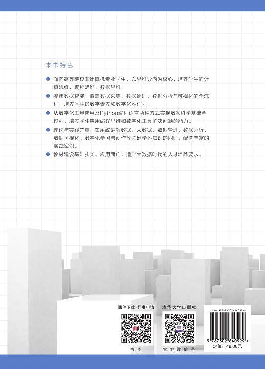 前言 随着互联网、云计算和大数据的蓬勃发展,信息技术得到了极大的普及与应用,在人文社科领域,定量研究越来越受到普遍重视。2014年,得克萨斯大学的艺术史学家Maximilian Schich在Science上发表了Quantitative social science. A network framework of cultural history,他带领团队收集了两千多年以来历史上15万西方文化名人的迁徙信息,通过数据分析与计算研究文化史的网络框架;美国杂志撰稿作家Ben Blatt出版了Nabokovs Favorite Word Is Mauve一书,他用统计学的方法,梳理了19世纪末到21世纪初1500部经典著作,拆解出优秀作品的写作规律;近年来,我国多家科研机构建设了面向人文社科研究的数据平台,为人文社科研究范式的创新与转型提供数据支撑。 2020年11月,教育部发布《新文科建设宣言》,重磅启动“新文科”建设。在人文社科领域,应用数据思维和数据科学方法进行科研探索,已成为必然趋势。新文科建设与人才培养要求针对人文社科领域的科研应用需求,结合文科专业学生特点,融入现代信息技术赋能文科教育。因此,面向新文科学生的素养养成,应该建设以数据思维为核心的教材体系,促进数据驱动的新文科研究范式发展,涵盖数据、大数据、数据管理、数据分析、数据可视化、数字化学习与创作等关键学科知识,培养学生应用数字化工具解决问题,全面提升学生的计算机素养、数字化胜任力和进行交叉学科科研创新的关键能力。 本教材致力于深化新文科大学计算机教学改革,培养具有形象思维、数据思维和编程思维的新...