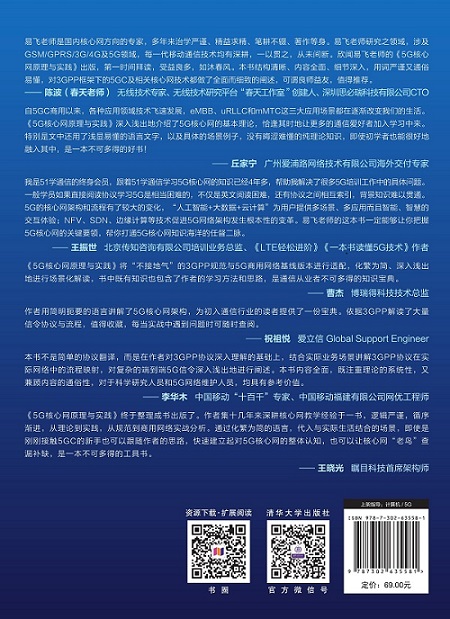 "易飞,爱立信东北亚区学院全球认证资深讲师,从事核心网相关培训超15年,深耕核心网领域,熟悉国内和全球主流核心网商用网络组网及厂家产品原理,常年为中国移动、中国联通、中国电信及海外运营商如软银、KDDI网络运维部门提供课程交付服务,深得学员好评,并多次赴瑞典总部学习交流。擅长使用生活化的场景举例来讲解枯燥的信令流程和特性。目前主要负责爱立信公司5G核心网及NFV相关产品的培训。著有《GPRS网络信令实例详解》和《EPC原理与实践》。何宇,任职于中国移动集团公司,从事核心网生产维护及生产管理工作14年,在日复一日的实践中积累了纵跨2G、3G、4G到5G核心网的丰富运维经验。刘子琦,毕业于北京邮电大学,获得通信与信息系统硕士学位。在通信外企500强工作十余年,从事2G、4G、5G网络测试、开发、基站系统架构设计。现就职于vivo通信研究院,主要关注于5G标准化,以及欧盟通信相关政策法规和标准研究。"