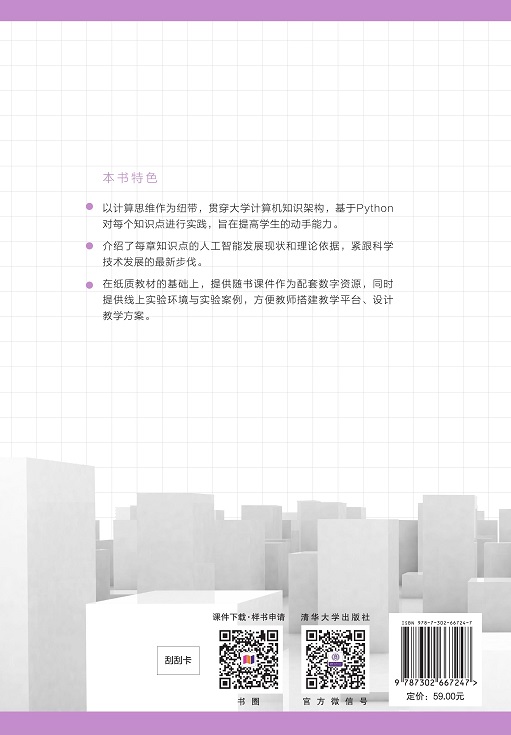 "本书着重在新工科背景下为所有工科计算机及非计算机专业的本科新生提供完整的计算机科学思维框架,以Python高级程序设计语言作为线索,简化计算机领域中的各个分支为模型,使用Python语言进行简易实现。 全书共8章,第1章从计算思维的角度概述计算机学科的整体脉络;第2章着重介绍计算机中对于数据和信息的编码原理;第3章对基础的Python语法做出介绍;第4章主要描述使用计算机解决问题的各类经典算法思想;第5章从底层出发介绍计算机的硬件系统和软件系统;第6章介绍计算机网络及网络安全;第7章介绍数据库系统;第8章对新时代下的计算机新技术——人工智能进行发散式介绍。本书还提供了大量应用实例,每章后均附有习题。 本书适用于高等院校工科专业本科一年级的相关课程,也可供教学工作人员设计本科实践课程时参考。"