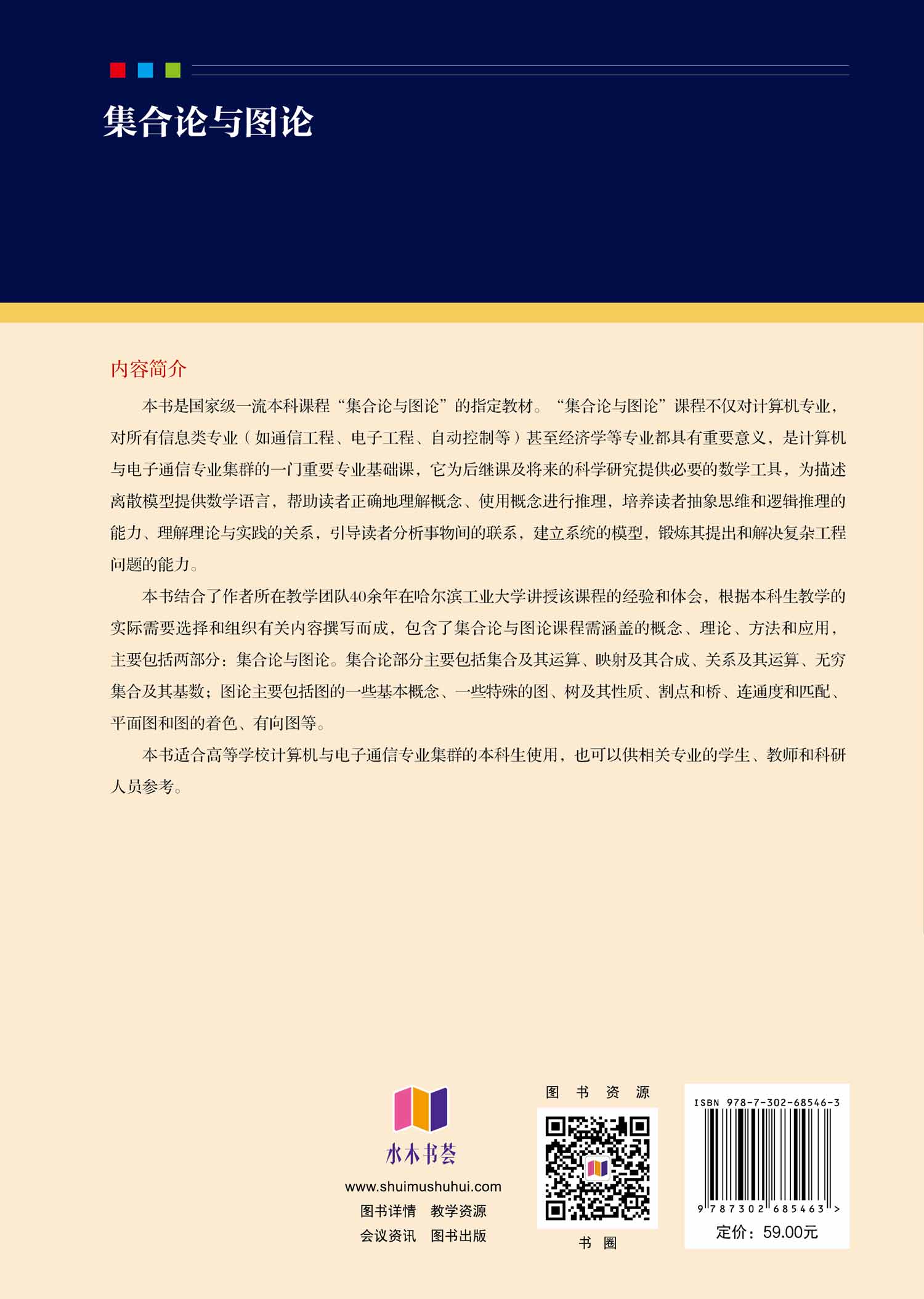 "本书是国家级一流本科课程“集合论与图论”的指定教材。“集合论与图论”课程不仅对计算机专业,对所有信息类专业(如通信工程、电子工程、自动控制等)甚至经济学等专业都具有重要意义,是计算机与电子通信专业集群的一门重要专业基础课,它为后继课及将来的科学研究提供必要的数学工具,为描述离散模型提供数学语言,帮助读者正确地理解概念、使用概念进行推理,培养读者抽象思维和逻辑推理的能力、理解理论与实践关系,引导读者分析事物间的联系,建立系统的模型,锻炼其提出和解决复杂工程问题的能力。 本书结合了作者所在教学团队40余年在哈尔滨工业大学讲授该课程的经验和体会,根据本科生教学的实际需要选择和组织有关内容撰写而成,包含了集合论与图论课程需涵盖的概念、理论、方法和应用,主要包括两部分: 集合论与图论。集合论部分主要包括集合及其运算、映射及其合成、关系及其运算、无穷集合及其基数;图论主要包括图的一些基本概念、一些特殊的图、树及其性质、割点和桥、连通度和匹配、平面图和图的着色、有向图等。 本书适合高等学校计算机与电子通信专业集群的本科生使用,也可以供相关专业的学生、教师和科研人员参考。"