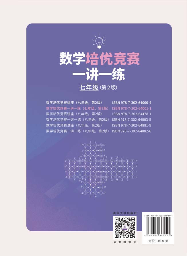 《数学培优竞赛一讲一练(七年级,第2版)》是《数学培优竞赛讲座(七年级,第2版)》(ISBN:9787302640004)的配套练习册,可为读者提供自我检测.在内容上以中考数学难题和国内外初中数学竞赛为背景,按照初中数学课程的进度分专题编写,力求与课堂教学同步. 在夯实基础的同时,通过新颖、有趣的数学问题,构建通往数学奥林匹克前沿的捷径;在巩固深化初中数学教材知识的同时,拓展有关中考数学和竞赛数学的知识,介绍令人耳目一新的解题方法与技巧. 本书有助于激发学生创新与发现的灵感,开发智力,提高学生中考数学和初中数学竞赛的成绩. 《数学培优竞赛一讲一练(七年级,第2版)》可供初中生及准备参加初中数学竞赛的学生使用,同时也适合中学数学教师、数学爱好者及高等师范院校数学教育专业的大学生、研究生和数学教师参考使用.