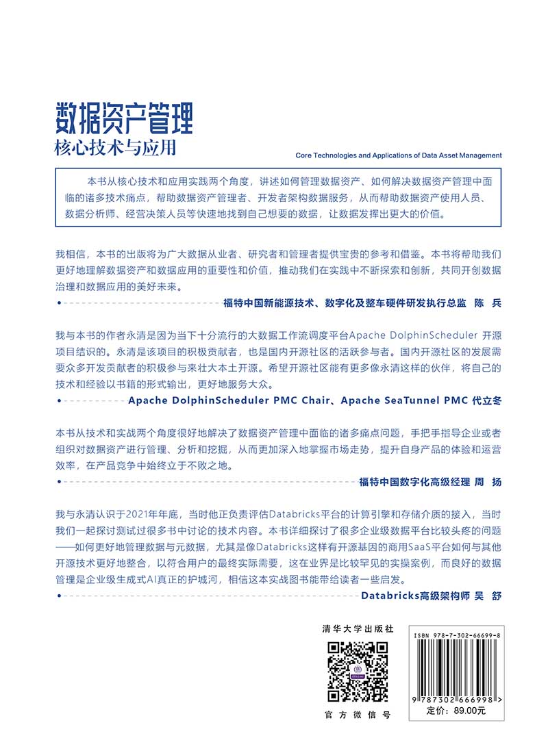 "《数据资产管理核心技术与应用》深入探讨数据资产管理的核心技术与应用,融入作者在大数据领域多年的丰富经验。《数据资产管理核心技术与应用》为读者提供一套可以落地的数据资产管理框架,并详解两个基于该框架进行数据资产管理的应用案例,使读者能更好地了解数据资产管理底层所涉及的众多核心技术,让数据可以发挥出更大的价值。《数据资产管理核心技术与应用》配套PPT课件、示例源代码、作者微信群答疑服务。 全书共分10章,第1章主要让读者认识数据资产,了解数据资产相关的基础概念,以及数据资产的发展情况。第2~8章主要介绍大数据时代数据资产管理所涉及的核心技术,内容包括元数据的采集与存储、数据血缘、数据质量、数据监控与告警、数据服务、数据权限与安全、数据资产管理架构等。第9~10章主要从实战的角度介绍数据资产管理技术的应用实践,包括如何对元数据进行管理以发挥出数据资产的更大潜力,以及如何对数据进行建模以挖掘出数据中更大的价值。 《数据资产管理核心技术与应用》适合数据资产管理者、数据资产管理初学者、数据应用开发工程师、数据分析师、数据库管理员、架构师、产品经理、技术经理作为技术参考书,也适合高等院校或高职高专数据资产管理相关课程的教学参考书。"
