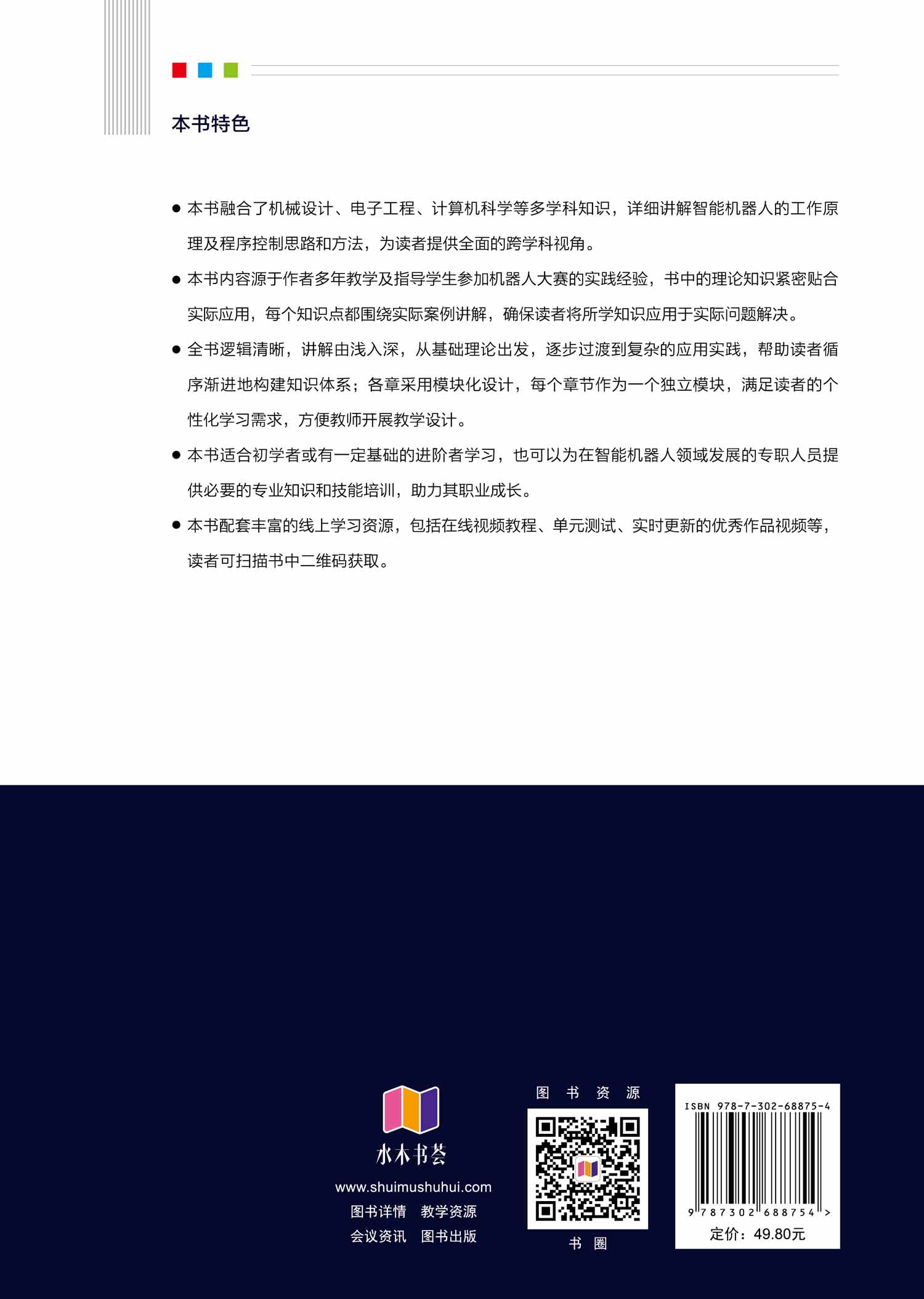 前言 深化产教融合是现代高等教育发展的重要抓手,也是加强高素质人才培养的必然要求。为响应国家“智能制造2035”整体规划以及产业发展对人才的迫切需求,以被誉为“制造业皇冠顶端明珠”的机器人作为载体组织教学,能够有效地提高学生的工程实践能力、创新能力、团队协作等综合能力。智能机器人是具有感知、思维和行动功能的机器,是机构学、自动控制、计算机、人工智能、微电子学、光学、通信技术、传感技术、仿生学等多种学科和技术的综合成果,是很好的研究和实践平台。 本书的内容大多源于作者多年从事机器人创新实践教学以及指导学生参加机器人大赛的经验,主要以讲解机器人的基础知识为主,学生动手制作机器人为辅。书中分别介绍机器人的相关概念、发展历程、基本工作原理以及用程序控制机器人的基本思路和方法,立足于机器人开发实践,是一本理论指导实践,实践验证理论的书。 全书共9章内容,第1章介绍机器人的概念、分类、发展历程等;第2章介绍移动机器人应用及实践、智能车的硬件组成、软件开发等;第3章介绍水中机器人基础及实践;第4章介绍空中机器人基础及应用;第5章介绍仿生机器人基础及实践;第6章介绍人工智能基础及应用;第7章介绍走进3D打印世界;第8章介绍智能制造与工业机器人;第9章介绍工程创新综合实践。本书内容兼具基础性和实践性。 本书配有完整的网络学习资源,在智慧树平台的名称为“机器人制作与创客综合能力实训”(https://coursehome.zhihuishu.com/courseHome/1000007851#teachTeam)。该资源自2019年在智慧树教学平台(www.zhihuishu.co...