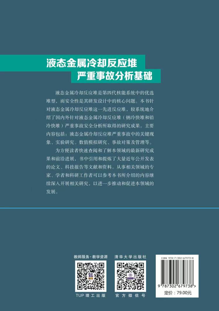 本书主要对液态金属冷却反应堆(钠冷快堆和铅冷快堆)严重事故分析相关的基础知识和前沿研究进行综合性介绍。内容包括: 绪论(世界核电发展背景和液态金属冷却反应堆发展概况)、液态金属冷却反应堆严重事故分析总论(基本概念、始发事件、严重事故进程和特征、与压水堆严重事故的比较)、液态金属冷却反应堆严重事故关键现象概述(熔融燃料池形成、熔融燃料迁移行为、FCI和熔融燃料碎化现象、碎片床现象、反应堆源项)、液态金属冷却反应堆严重事故实验(堆芯熔融物行为、燃料冷却剂相互作用、碎片床行为、放射性裂变产物迁移行为)、液态金属冷却反应堆严重事故数值模拟(数值模拟方法、模拟分析程序、关键现象模拟分析)、液态金属冷却反应堆严重事故对策及管理(管理指南、预防设计、缓解措施)以及总结与展望。
