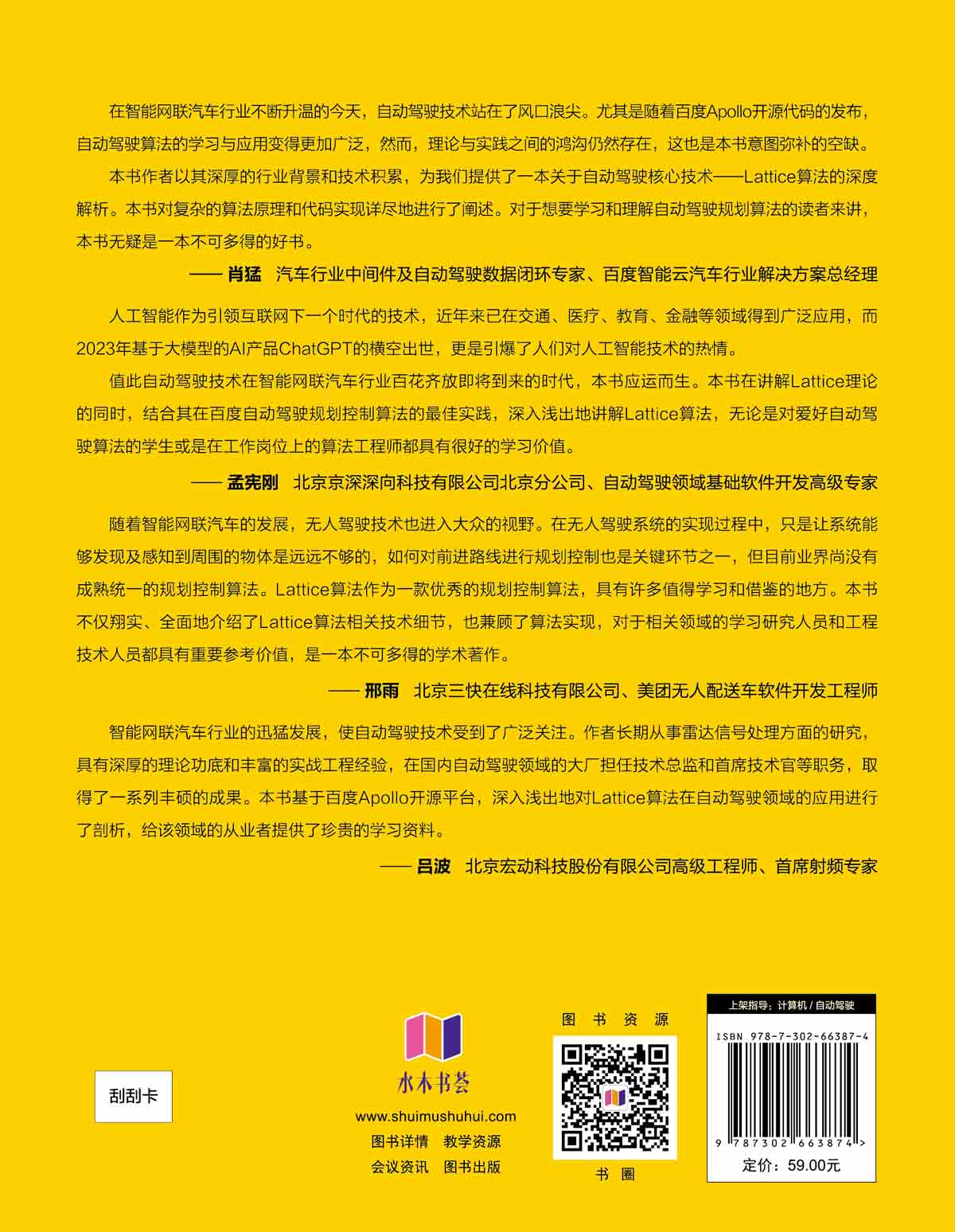 "本书以Apollo 6.0自动驾驶算法为背景,以Lattice运动规划算法为主线,以线性插值、frenet坐标与笛卡儿坐标转换、4次多项式与5次多项式、二次规划等为算法的理论基础,引导读者由浅入深的了解Frenet坐标系提出的背景、Frennet坐标与笛卡儿坐标系之间的相互转化关系、静态障碍物与动态障碍物S-T图的生成、横纵向运动轨迹的生成与优化等内容,讲解注重理论与代码的结合,既可以有效加深读者对算法的进一步理解与认知,也可以提升读者算法工程化的实操能力。 本书共8章,从Apollo 6.0代码入手,按照代码的实现流程,详细讲述了Lattice规划算法在不同阶段的处理过程,例如Frenet坐标系与Cartesian坐标系之间的转化关系与各个公式的推导过程、参考线的离散化、静态障碍物与动态障碍物的生成、横纵向轨迹与多项式的运用,碰撞检测与轨迹的优化等内容,从零起步,系统深入地剖析了Lattice算法的核心原理与知识点。本书示例代码丰富,实际性和系统性较强,关键章节配有详细的视频讲解,助力读者透彻理解书中的重点与难点。 本书不仅适合初学者入门,算法公式的推导过程与代码的对比分析对于工作多年的开发者也有参考价值,并可作为高等院校和培训机构自动驾驶专业的教学参考书。 "
