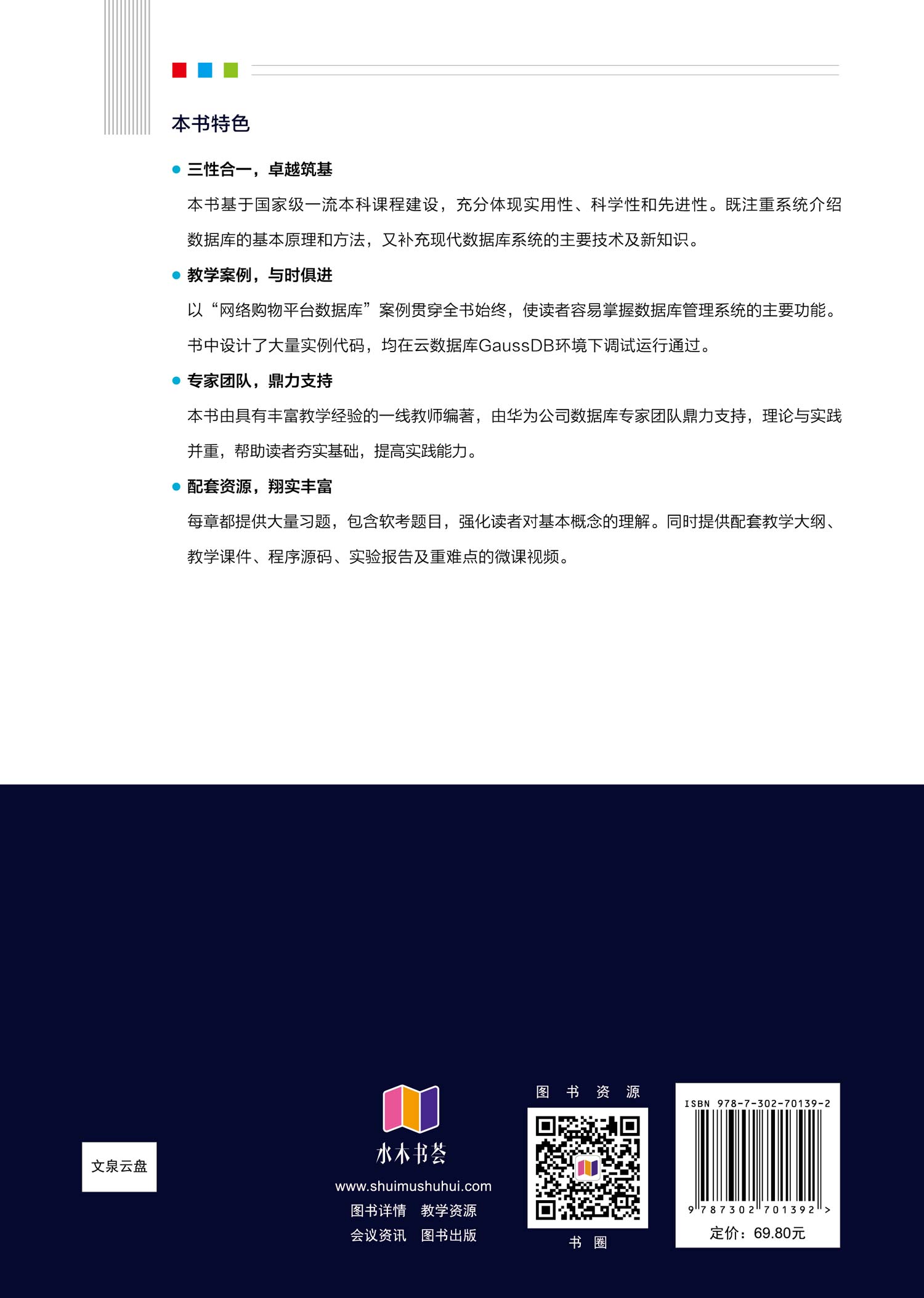 前言 在这个信息化飞速发展的时代,互联网、云计算、大数据等新兴技术正以前所未有的速度改变着人们的思维方式、生产模式、生活方式及学习习惯。这些技术不仅展示了世界发展的美好前景,也为我们带来了前所未有的挑战和机遇。在这一背景下,数据库技术作为计算机科学的一个重要分支,不仅是信息技术和信息产业的基石,更是推动各行各业实现数字化转型的关键技术。 数据库课程因此成为高等教育中不可或缺的一部分,无论是计算机专业还是信息管理、物联网、电子信息等相关专业,数据库原理及应用都是学生们必须掌握的核心知识,是这些专业的必修课。随着教育改革的不断深入,对于高素质人才的培养提出了更高的要求。学生们不仅要有扎实的理论基础,还应具备解决实际问题的能力,并对学科的最新研究领域和发展方向有所了解。本书正是在这样的背景下应运而生,编写内容具有较强的科学性、实践性和先进性。 全书共分4篇13章,章节安排以数据库原理为基础,以“网络购物平台数据库”的实际应用为主线展开,内容讲解由浅入深,层次清晰,通俗易懂。 第一篇为数据库基础知识(第1~3章)。第1章介绍数据库的基本概念、数据管理技术的发展、数据库系统的特点,概述数据模型、数据库系统体系结构、数据库应用系统的开发架构、数据库应用和技术研究现状。第2章介绍关系数据库基础,包括关系数据库概述、关系模型、实体联系模型向关系模型的转换和关系代数等内容。第3章介绍云数据库GaussDB的发展历程、特点以及GaussDB与其他服务的关系,重点介绍GaussDB的体系架构、数据库的创建和管理、表空间的创建和管理。本书的实践环节采用云数据库GaussDB。 第二篇...