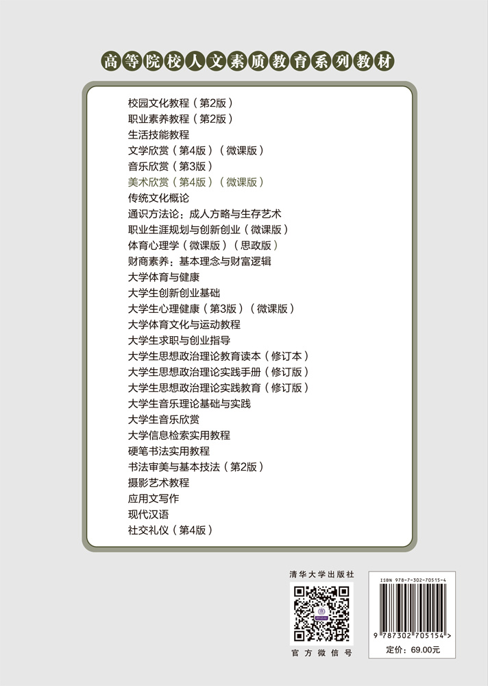 "《美术欣赏(第4版)(微课版)》针对大学人文素质教育、公共艺术教育和推动社会文化大发展的需要而编写,自2006年第1版发行以来,历经十几年的教学实践检验,深受广大师生和社会各界人士的欢迎。本次再版修订保留了前3版比较成熟的框架和风格,以更专业和精准的阐述、更宽泛的知识涵盖、更高雅和丰富的插图,使读者从古今中外的美术知识、历史发展、中西对比等各方面获得更加全面的美术基础知识和美术鉴赏知识,从而更有效地指导大学生和读者的美术欣赏实践。 《美术欣赏(第4版)(微课版)》打破了过分强调美术欣赏的系统性和完整性的局限,紧贴现代生活,切合学生和大众兴趣,配有300多幅彩色图片,内容丰富多彩,图文并茂,具有较强的直观性和资料性,无论是为教师的授课,还是为读者课外自学都提供了极大的方便。 《美术欣赏(第4版)(微课版)》既可作为高等院校公共艺术教育的规范教材,也可作为各地图书馆、文化馆、社区文化站、老年大学等社会各界人士必备的审美素质教育读物。 "