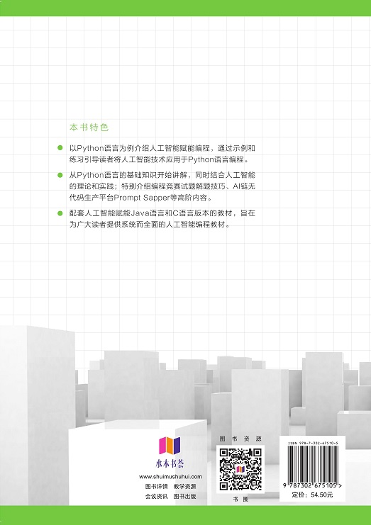 "本书是一本全面探讨人工智能在Python编程领域应用的教材,内容涵盖从Python编程语言的基础知识到高级编程技巧,再到人工智能赋能实际应用的全面内容,主要包括Python语言基本概念,人工智能辅助工具概况,Python数据类型、运算符与表达式,Python控制结构、函数、数据结构、文件处理以及面向对象编程等复杂的编程概念。本书同时专注于人工智能工具在编程中的高阶应用,引导读者学习如何利用Python解决各类大赛中的竞赛题,以及如何在团队研究中高效使用各种工具,使读者能够将理论知识与实践紧密结合,拓展人工智能领域的应用视野与能力。 整体而言,本书是为希望掌握人工智能赋能Python语言的学习者量身定做的。通过系统的学习和实践,本书可以帮助读者更好地适应未来技术的发展需求。 "