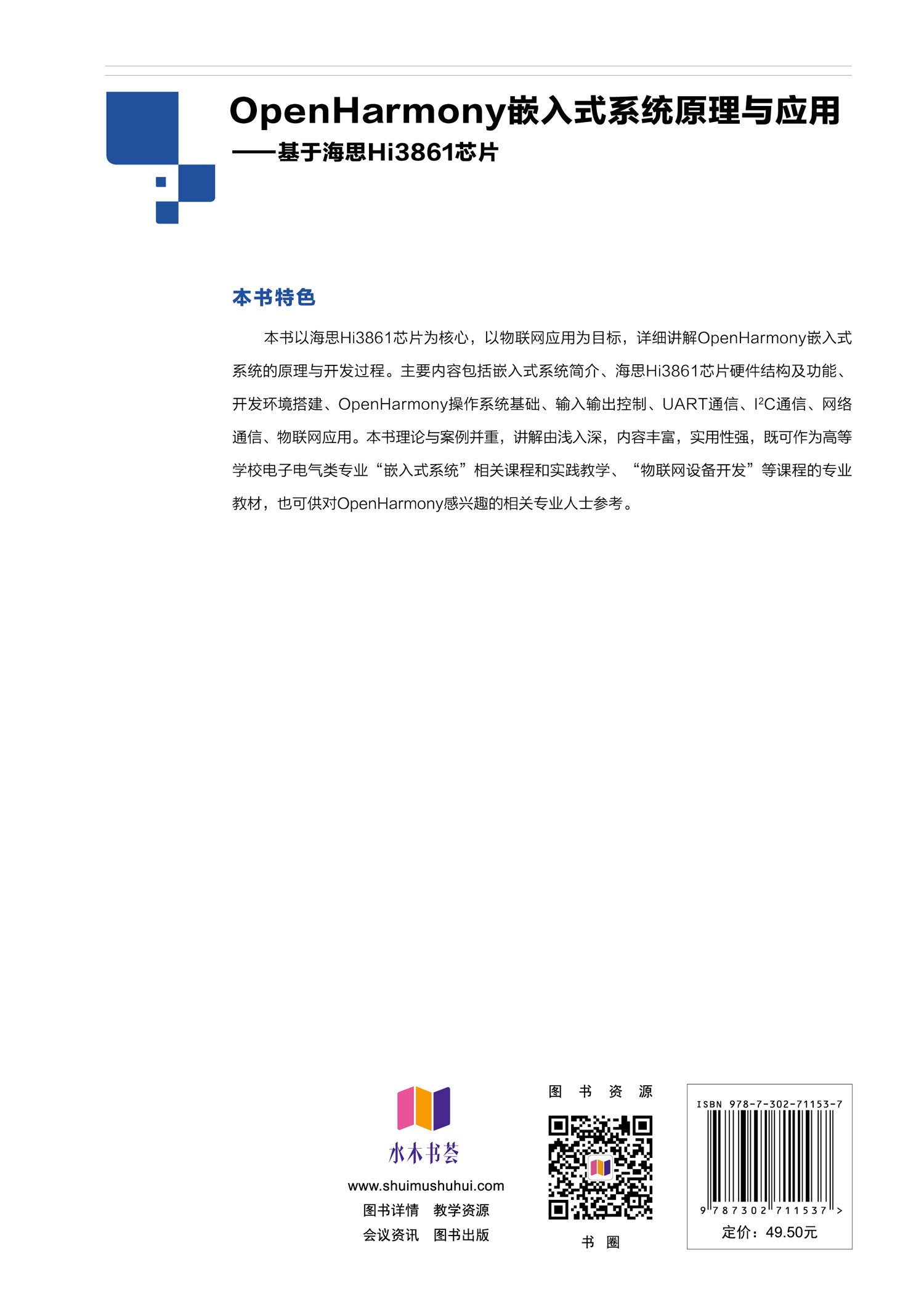 "本书以海思Hi3861芯片为核心,以物联网应用为目标,详细讲解OpenHarmony嵌入式系统的原理与开发过程,主要内容包括嵌入式系统简介、海思Hi3861芯片硬件结构及功能、开发环境搭建、OpenHarmony操作系统基础、 输入输出控制、UART通信、I2C通信、网络通信、物联网应用。 本书理论与案例并重,讲解由浅入深,内容丰富,实用性强,既可作为高等学校电子电气类专业嵌入式系统相关课程和实践教学、物联网设备开发相关课程的专业教材,也可供对OpenHarmony感兴趣的相关专业人士参考。 "