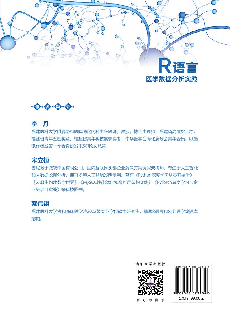 "李丹,福建医科大学附属协和医院消化内科主任医师,教授,博士生导师,福建省高层次人才,福建省青年五四奖章、福建省青年科技奖获得者。中华医学会消化病分会青年委员。以通讯作者或第一作者身份发表SCI论文16篇。宋立桓,曾服务于微软中国有限公司,国内互联网头部企业解决方案资深架构师,专注于人工智能和大数据挖掘分析,拥有多项人工智能发明专利。著有《Python深度学习从零开始学》《云原生构建数字世界》《MySQL性能优化和高可用架构实践》《PyTorch深度学习与企业级项目实战》等科技著作。蔡伟祺,福建医科大学协和临床医学院2022级专业学位硕士研究生,精通R语言和公共医学数据库挖掘。"