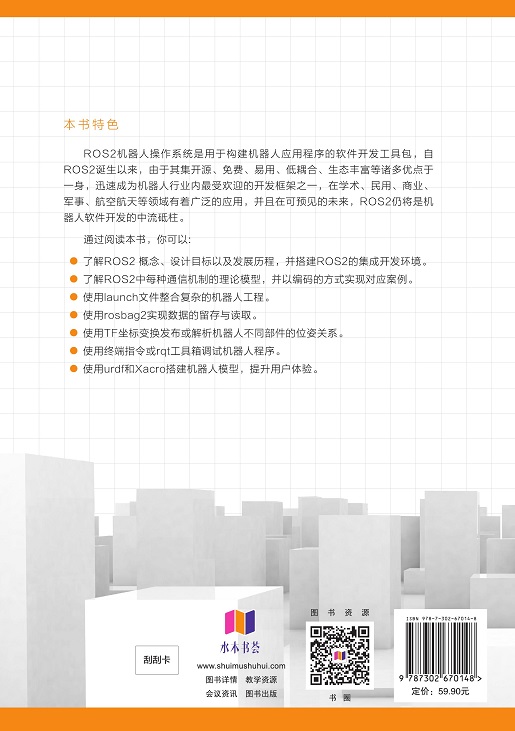 前言 随着科技的不断发展,机器人技术在各领域的应用越来越广泛。而机器人操作系统(ROS)作为一种用于构建机器人应用程序的软件开发工具包,已成为机器人行业内深受欢迎的开发框架之一。ROS集开源、免费、易用、低耦合、生态丰富等诸多优点于一身,迅速赢得了广泛的认可和应用。 本书旨在为读者提供ROS2的全面学习指南,帮助读者深入了解ROS2及环境搭建,通信机制核心,通信机制补充,多种ROS2工具如launch、rosbag2、TF(坐标变换)、rviz2可视化等。通过本书的学习,读者将系统地掌握ROS2的核心知识和工具使用,为机器人开发打下坚实的基础。 第1章“ROS2概述与环境搭建”作为本书的开篇,将带领读者逐步了解ROS2的发展历程、组成体系、优势、安装和快速体验等内容。通过本章的学习,读者将对ROS2有全面的认识,并为后续学习做好准备。 第2章“ROS2通信机制核心”将重点介绍ROS2中的通信机制,包括话题通信、服务通信、动作通信和参数服务等。通过本章的学习,读者将了解不同功能模块之间如何进行数据交互,掌握ROS2中通信机制的核心知识。 第3章“ROS2通信机制补充”将进一步介绍分布式框架搭建、重名问题处理、常用API、通信机制工具等内容,并通过练习强化对ROS2通信机制的认识。本章将帮助读者深入理解ROS2通信机制的补充知识,为实际应用提供支持。 第4章“ROS2工具之launch与rosbag2”将系统地介绍ROS2中的launch文件和rosbag2工具的使用。通过本章的学习,读者将了解如何使用launch文件启动节点和如何使用rosbag2工具实现话题...
