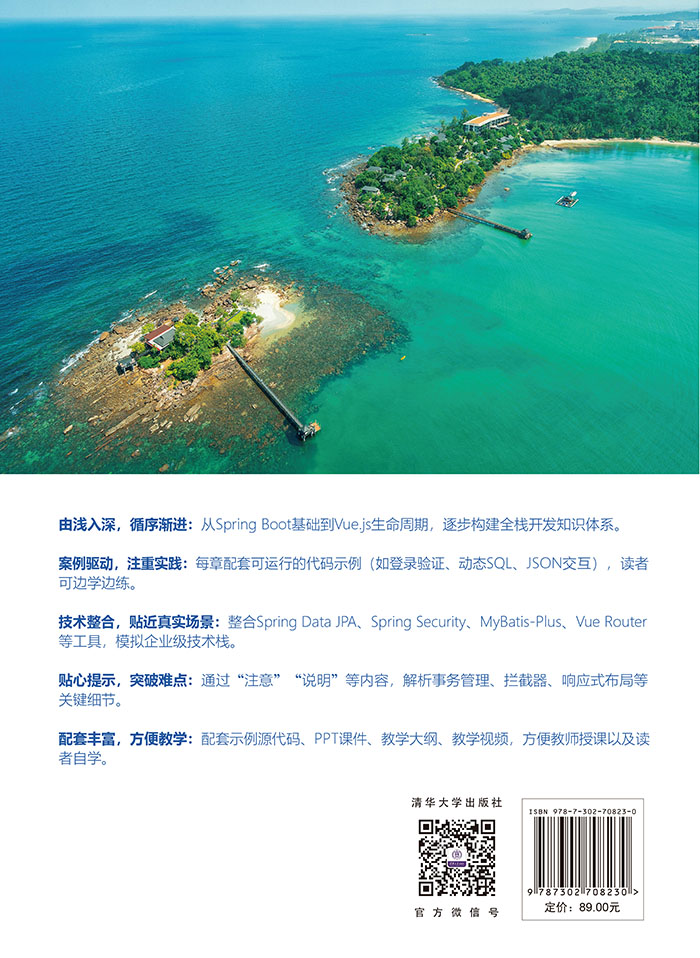 "(1)《Spring Boot+Vue全栈开发实践:视频教学版》面向全栈开发者,系统讲解基于Spring Boot 3与Vue.js 3的前后端分离开发技术栈。