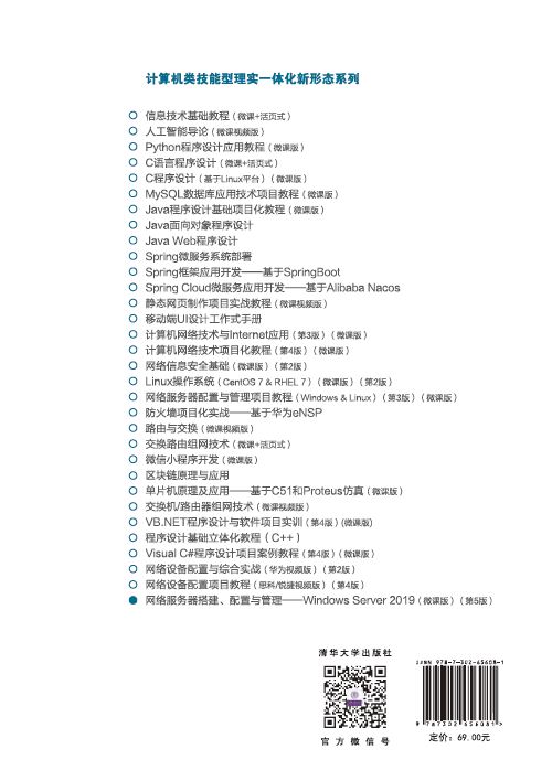 前言 1. 编写背景 习近平总书记在党的二十大报告中指出“科技是第一生产力、人才是第一资源、创新是第一动力”。大国工匠和高技能人才作为人才强国战略的重要组成部分,在现代化国家建设中起着重要的作用。 网络强国是国家的发展战略。要实现网络强国,不但要在网络技术上领先和创新,而且要确保网络不受国内外敌对势力的攻击,保障应用系统正常运营。因此,网络技能型人才的培养显得尤为重要。 《网络服务器搭建、配置与管理——Windows Server 2016(第4版)(微课版)》自出版以来,已重印多次,鉴于未来的几年中Windows Server 2019将逐渐替代Windows Server 2016而成为企业应用的首选Windows服务器操作系统,以及目前Windows Server 2019教材严重缺乏的现状,根据教育部发布的教育信息化2.0行动计划、精品在线开放课程建设、“三教”改革及金课建设要求,结合计算机领域发展及广大读者的反馈意见,在保留原书特色的基础上,采用“纸质教材+电子活页”的形式对教材进行了全面修订,即利用互联网技术扩充教材内容,在纸质教材外增加包含视频、音频、作业、试卷、拓展资源、主题讨论、扩展的项目实训视频等数字资源,实现纸质教材三年修订、电子活页随时增减和修订的目标。 2. 本书特点 本书共包含11个项目,最大的特色是“易教易学”,音、视频等配套教学资源丰富。 (1) 落实立德树人根本任务,坚定文化自信,践行二十大报告精神。充分认识党的二十大报告提出的“实施科教兴国战略,强化现代人才建设支撑”的精神,落实“加强教材建设和管理”新要求。在保留第4版教材已有...