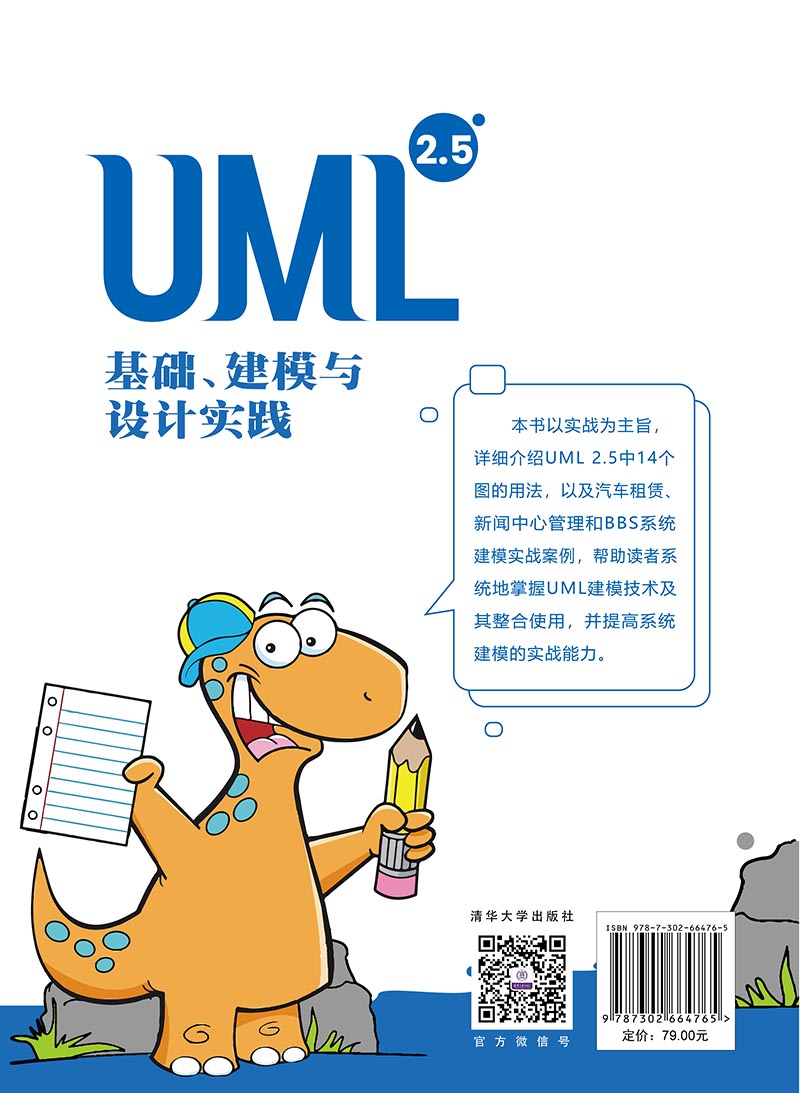 前 言 从1946年诞生第一代电子管计算机开始,软件开发已有近70多年的历史。在这段时间里,面向对象技术的深入研究和广泛应用也已近50年,它已经成为软件开发中分析、设计和实现的主流方法。在过去的50年中,随着面向对象技术的发展,相关的软件设计工具和规范也获得了显著进步。其中,最重要的成就之一是统一建模语言(Unified Modeling Language,UML)的出现,这是面向对象建模技术的一个标志性成果。 UML的创建始于1994年10月,由Grady Booch和Jim Rumbaugh开始致力于这项工作。1996年6月,他们发布了UML的初个版本UML 0.9。随后,10多家公司组成了UML伙伴组织,共同提交了UML 1.0和UML 1.1版本。1997年11月17日,对象管理组织(OMG)开始将UML纳为其标准建模语言。 在接下来的几年中,OMG主导了UML的多个版本修订,包括1.2、1.3、1.4和1.5版本。进入21世纪后,OMG推出了更为深入的修订版本,最终发布了UML 2.0版本,这一版本被广泛接受为标准建模语言。2011年8月,官方发布了UML 2.4.1版本。2015年6月,UML 2.5版本正式发布,本书将以这个版本为基础,讲解UML建模。 本书内容 本书基于使用广泛、工具齐全的UML 2.5版本,详细讲解建模语言及其系统建模过程。本书共分12章,内容划分如下: ?第1~3章:着重介绍UML的预备知识,包括UML概述、面向对象概述、常见的UML建模工具以及Draw.io的用法等。 ?第4~9章:着重介绍UML的各种图,包括...