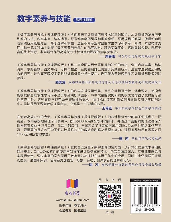 (3)配有微课视频,方便易用。本书所有讲解内容均已录制成视频,读者只需扫描书中提供的二维码,便可以随时观看,轻松掌握相关知识。尤其是针对MS Office操作部分和多媒体技术应用部分,准备了大量实践案例,以加强学生实际应用技能的培养。