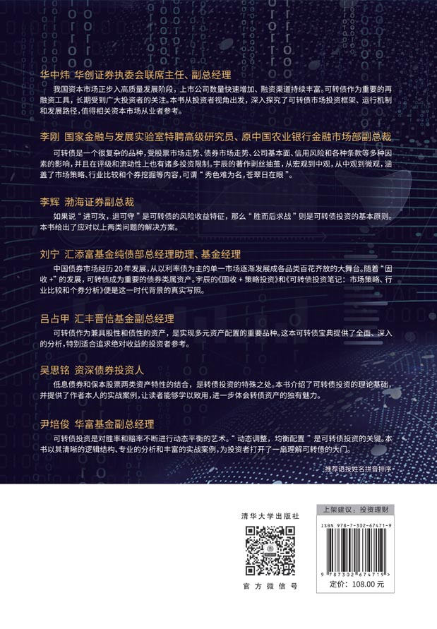 "《可转债投资笔记:市场策略、行业比较和个券分析》是作者近年来实盘管理可转债投资组合的经验总结。作者从机构投资者的专业角度,深度分享了其在转债投资领域的独到见解与感悟,通过跨资产比较的方式,全面剖析了可转债策略的应用,细致复盘了市场行情的变化,并对可转债涉及的相关行业及部分个券进行了系统梳理。本书内容逻辑清晰,语言简洁,对投资者深入了解可转债投资具有极高的参考价值。 《可转债投资笔记:市场策略、行业比较和个券分析》可作为可转债投资者的参考资料,对纯债投资者、股票投资者和PIPE投资人有借鉴意义,也是泛财富管理从业者和财经媒体人提升专业能力的好帮手。"