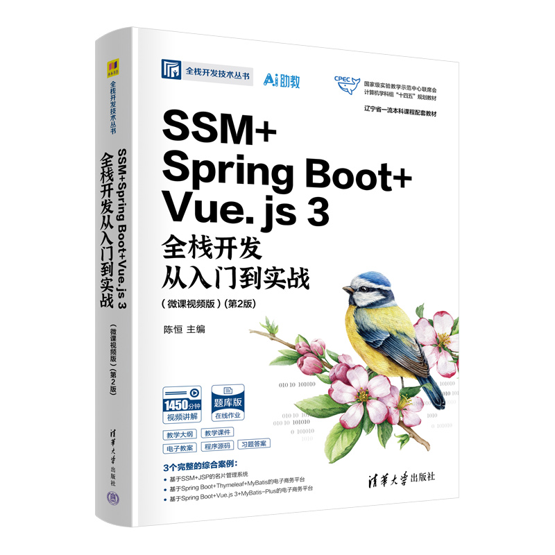 前言 本书适合具有Java编程基础和一定Java Web相关知识的读者学习。 本书是第2版,使用Spring Framework 6.1.5+MyBatis 3.5.14+Spring Boot 3.2.4+Vue.js 3.4.21+MyBatisPlus 3.5.5编写实例。与第1版相比,本书删除了监控Spring Boot应用、人事管理系统的设计与实现等内容,增加了MyBatisPlus基础知识。 本书系统地介绍SSM、Spring Boot、MyBatisPlus和Vue.js 3的重要内容,分三个阶段: 第一阶段为SSM框架整合开发(第1~4章),内容包括Spring、Spring MVC、MyBatis以及基于SSM+JSP的案例开发;第二阶段为Spring Boot框架开发(第5~11章),内容包括Spring Boot的入门、核心、Web开发、数据访问、安全控制、异步消息以及基于Spring Boot+MyBatis+Thymeleaf的案例开发;第三阶段为Vue.js 3前端框架开发(第12~16章),内容包括Vue.js基础、Vue.js进阶、MyBatisPlus、单元测试以及基于Spring Boot+Vue.js 3+MyBatisPlus的案例开发。本书的重点不是框架知识的简单介绍,而是精心设计的大量实例和案例。读者通过本书可以快速掌握SSM、Spring Boot、Vue.js、MyBatis、MyBatisPlus等框架的实践应用,提高Java EE应用的开发能力。 全书共16章,具体如下。 第一阶段: SSM框架整...