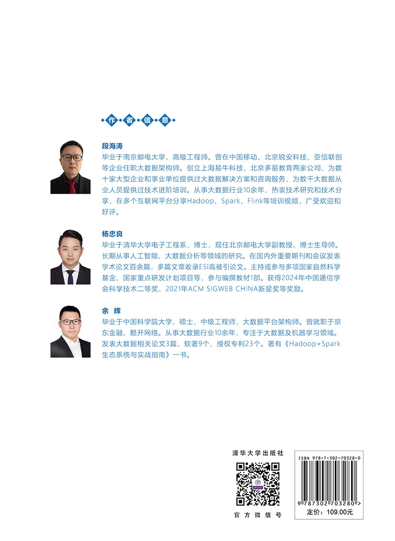 "段海涛,毕业于南京邮电大学,高级工程师。曾就职于中国移动、中国石油、亚信科技等。从事大数据行业10余年,海易牛科技(大数据平台开发技术服务)和北京多易教育(大数据技术培训)创始人。为中国移动、用友软件、四方精创及多个城市的数据局等企业和单位提供过解决方案和技术咨询服务;为数千有志进入大数据开发行业的大学生提供了就业培训服务。在多个互联网平台公开Hadoop、Spark、Flink等大量培训视频,广受欢迎和好评。杨忠良,毕业于清华大学电子工程系,博士,北京邮电大学副研究员、博士生导师。长期从事人工智能、大数据分析等领域的研究。在国内外重要期刊和会议发表学术论文80余篇,多篇文章收录ESI高被引论文。主持或参与多项国家自然科学基金、国家重点研发计划项目等,参与编撰教材1部。获得 2024年中国通信学会科学技术二等奖,2021 年 ACM SIGWEB CHINA 新星奖。余辉,毕业于中科院,硕士,中级工程师,大数据平台架构师。曾就职于京东金融、酷开网络。从事大数据行业10余年,专注于大数据及机器学习领域。发表大数据相关论文3篇,发表软著10多个,授权专利30多个。著有《Hadoop+Spark生态系统与实战指南》。"