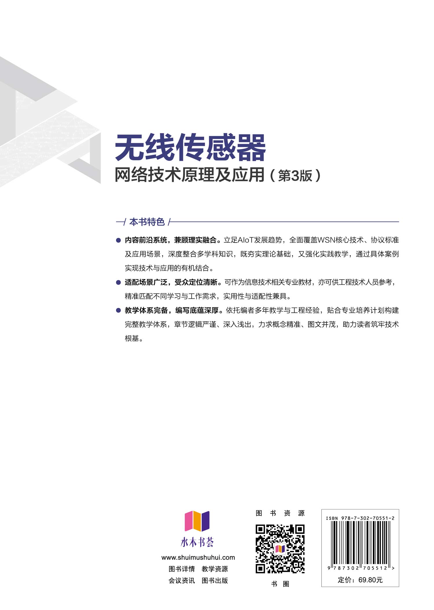 提供教学大纲、教学课件、电子教案和答案,期末试卷。"内容前沿系统,兼顾理实融合。 立足AIoT发展趋势,全面覆盖WSN核心技术、协议标准及应用场景,深度整合多学科知识,既夯实理论基础,又强化实践教学,通过具体案例实现技术与应用的有机结合。