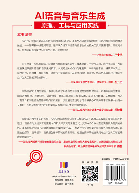 实践性强:详解33个类型丰富、由易到难的典型应用案例,涵盖AI语音与音乐生成的各种常见场景应用,帮助读者快速提高实际动手能力。
