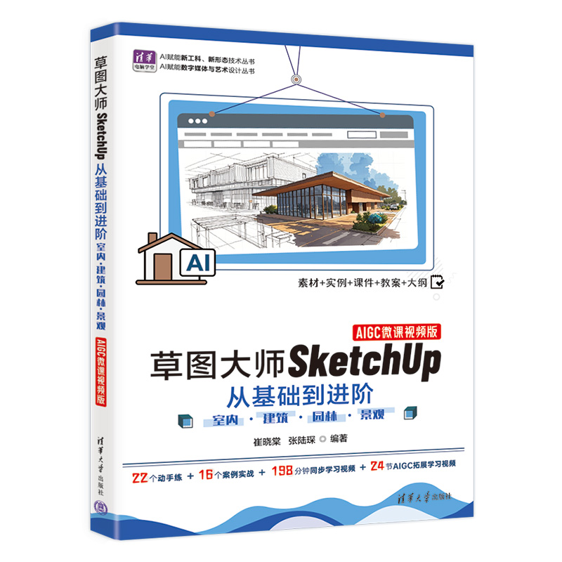 前 言 SketchUp是三维建模领域的轻量型利器,在建筑设计、室内装饰、景观规划等行业被广泛应用。它以简洁易用的操作逻辑、直观高效的建模方式著称,能让设计师快速将创意草图转化为三维模型,是从设计构思到方案呈现的得力助手。同时,SketchUp具备良好的扩展性,与众多插件如V-Ray、Enscape等完美兼容,还能与AutoCAD、Revit、3ds Max等软件顺畅交互,极大地提升了设计工作的整体效率。因此,熟练使用SketchUp 已成为建筑、室内等领域设计师的必备技能。 本书从零基础读者的需求出发,用通俗易懂的语言系统地讲解SketchUp的各项核心功能,内容涵盖软件界面操作、视图风格化设置、基础绘图与建模、组件与群组应用、材质与贴图编辑、相机与场景设置、文件输出与场景渲染等知识点。 值得一提的是,本书紧跟技术发展潮流,融入了AIGC工具的相关应用。在人工智能快速发展的当下,编者精心整理了AI辅助快速建模、智能生成材质纹理、自动优化并渲染模型等实用技巧,帮助读者了解并运用智能化的设计手段,从而进一步优化设计流程,提高创作效率。 内容概述 全书共9章,各章内容见表1。 表1 章序 内容 难度指数 第1章 主要对SketchUp软件的操作界面以及基础设置进行简单的讲解,包括软件的核心功能、应用领域、工作界面,绘图环境的设置,以及AI智能辅助工具的介绍 ★☆☆ 第2章 主要对视图显示模式及样式风格化设置进行讲解,包括视图设置、对象风格化设置、对象面的设置等 ★★☆ 第3章 主要对基础建模技术进行讲解,包括对象的选择、对象的显示和隐藏、基本图形...