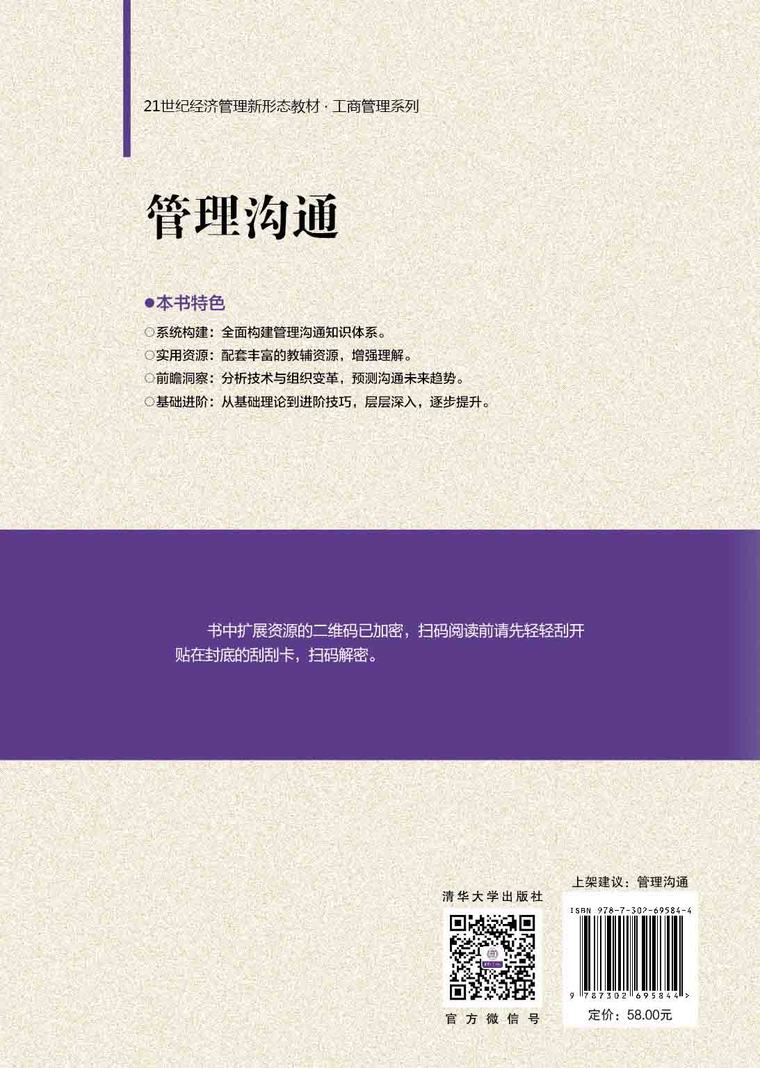 "本书全面深入地探讨了管理沟通的核心理论与实务技巧。共分为十章,系统构建了管理沟通的知识体系。 第一章至第三章为基础部分,详细介绍了管理沟通的基本概念、特点、作用及过程,探讨了管理沟通的技巧,包括会议与面谈、非语言沟通与倾听等,并深入分析了团队沟通与协作的重要性及策略。第四章至第六章则进一步探讨了冲突管理与谈判技巧、跨文化沟通以及领导与沟通的关系,帮助读者理解在不同情境下如何进行有效沟通。第七章至第十章为进阶部分,着重讲解了沟通中的情绪管理与心理调适、沟通效果评估与反馈、书面沟通以及管理沟通的未来趋势。特别是第十章,针对当前技术变革和组织变革的背景,分析了管理沟通面临的挑战,并预测了未来的发展趋势。 本教材配有丰富的辅助性资源,包括视频、案例等,读者在学习过程中可以扫码获取,以便更深入地理解和掌握管理沟通的知识与技能。本书适合作为管理沟通课程的教材,也适合广大管理者和沟通爱好者自学使用。"